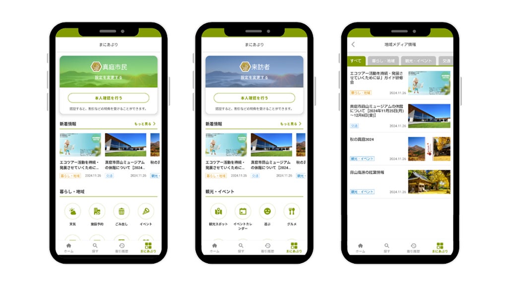 「まにあぷり」では、デジタル市民証の発行や地域メディア情報の閲覧、各種ミニアプリの利用が行えます。デジタル市民証はマイナンバーカードをかざすことで取得でき、割引等の特典が受け取れるようになります。地域メディア情報では、真庭市の観光情報などを取り扱う複数のWebメディアの情報からキュレーションされた最新情報を閲覧できます。ミニアプリでは、暮らし・地域、子育て・教育等、多様なサービスを提供していく予定です。