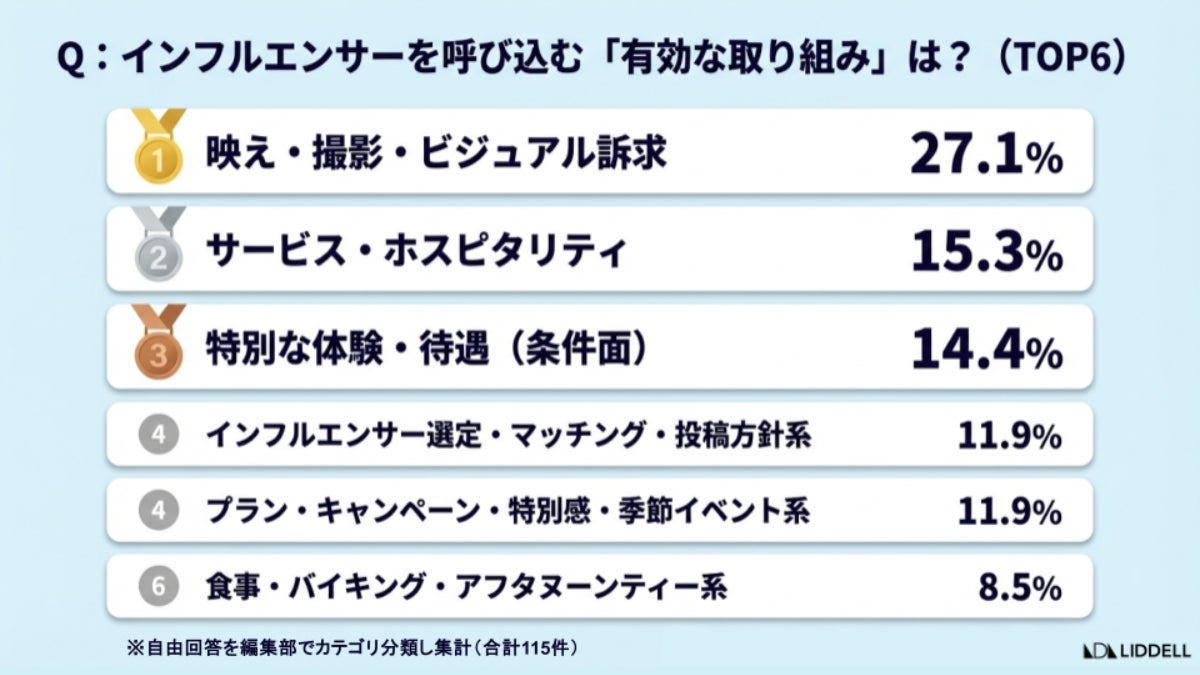 インフルエンサーを呼び込む取り組みでは、「映え・撮影」27.1%が最多。次いで「ホスピタリティ」15.3%、「条件面(特別体験・待遇等)」14.4%でした。実際の声でも「オシャレな写真が撮れる空間を作る」といった“ 撮れる ”視点に加え、「従業員のおもてなし。人が人を呼ぶから」のように“ 気持ちいい体験 ”を重視する声もありました。さらに「同伴者(撮影者)にも同じサービスが提供していただけるか」といった“ やりやすさ ”を求める声が挙がっています。インフルエンサーは同伴者がいることで楽しい雰囲気や居心地の良さ、撮影のバリエーションが増え喜ばれます。