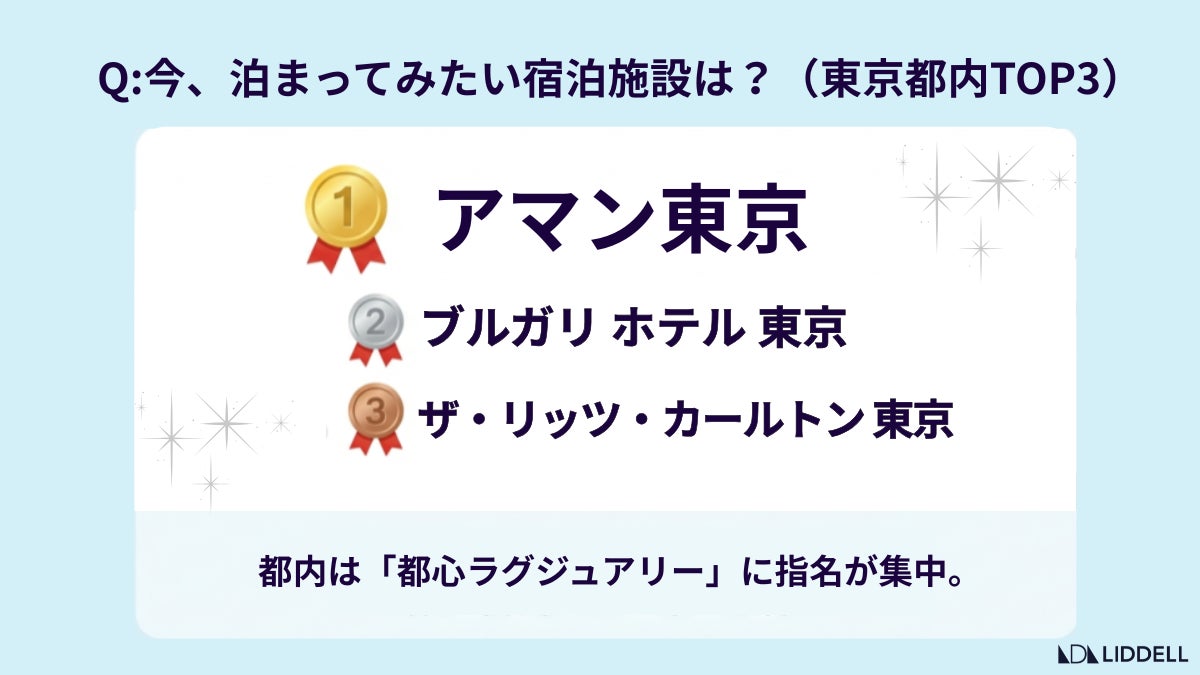 「泊まってみたい宿」の集計を見ると、都内は都心ラグジュアリーに指名が集中する一方、全国では“ リゾート&温泉 ”系が上位に入りました。ランキング上位には、都内ではラグジュアリーホテル、全国ではリゾートや温泉地の宿が並び、インフルエンサーが“ 今、行きたい ”と感じる方向性がうかがえます。つまり、ランキングは単なる“ 好み ”ではなく、「行きたい理由」が言語化される前の欲求を映すヒントになり得ます。こうした「今、指名される宿」は、インフルエンサーだけでなく、一般の旅行者がこれから求める“ 行きたい理由 ”の先取りになっている可能性があります。