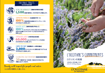 創設当初から、南仏プロヴァンスをはじめとする豊かな自然や、そこから生まれる製品を作り出す人々と技術を守ることを使命とし、自然の保護や人を大切にする取り組みを長年続けてまいりました。現在では「ロクシタンの約束」として、「植物の多様性の保護」、「生産者をサポート」、「地球の自然にやさしく」、「女性の自立の支援」「視覚障害への取り組み」、「伝統的技術の継承」の6つを主要な活動分野として定め、それぞれに対し具体的な数値目標を掲げ、その目標達成に向けて各国で様々なCSR活動を行っております。