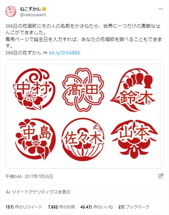 「366日の花ずかん」は、366日(うるう年の2月29日を含む)一日ごとに定められた、花をモチーフにしたバースデーシンボル「花個紋」にその人の名前を重ねたオーダーメイドのはんこ。