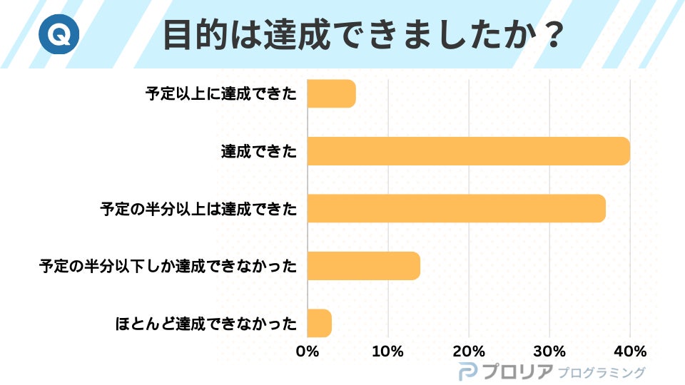 目的達成度:学習者全体の約8割が目標を「半分以上達成」し、特に「転職」を目的とした層では65%が予定以上・達成レベルで成功