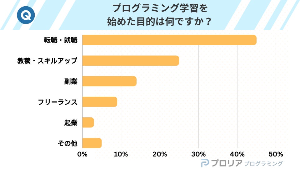 学習目的:「転職・就職」が(45%)で最多、次いで「スキルアップ」(25%)、独学でも明確なキャリア志向が強い