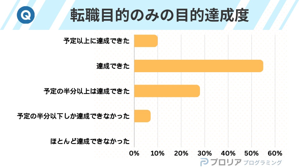 65%の人が想定よりも良い結果を出しており、独学で転職を目指す人にも十分チャンスがあることが分かりました。スクールに頼らずとも、計画的な学習を続けることで新たなキャリアへ踏み出せる可能性が示されています。