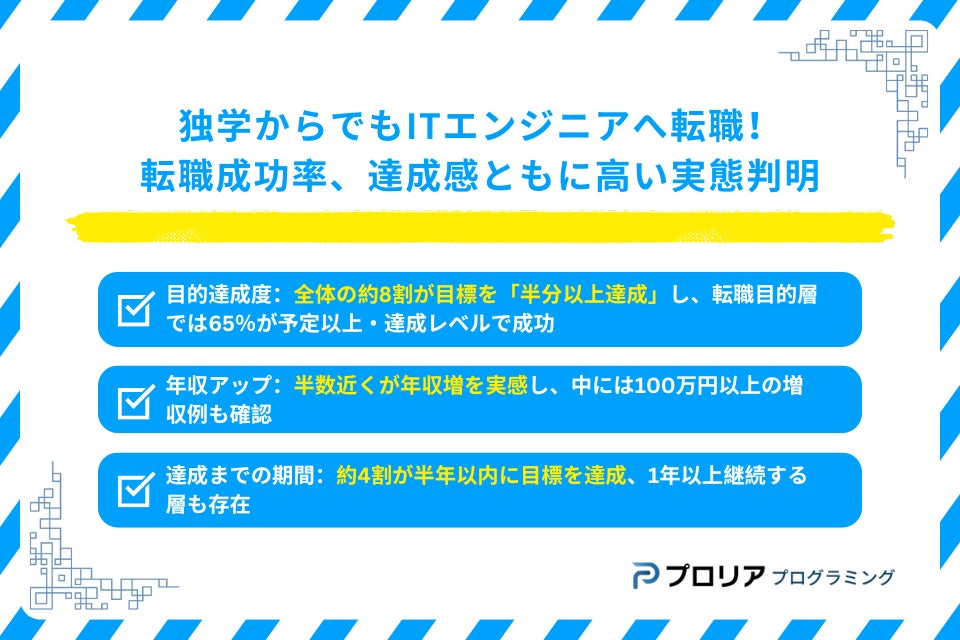 独学者が「転職」を主目的に据えるケースが多い中で、目標達成率や年収増加などの好例が確認できた点は、プログラミング学習において必ずしもスクール頼みでなくとも成功が可能であることを示しています。