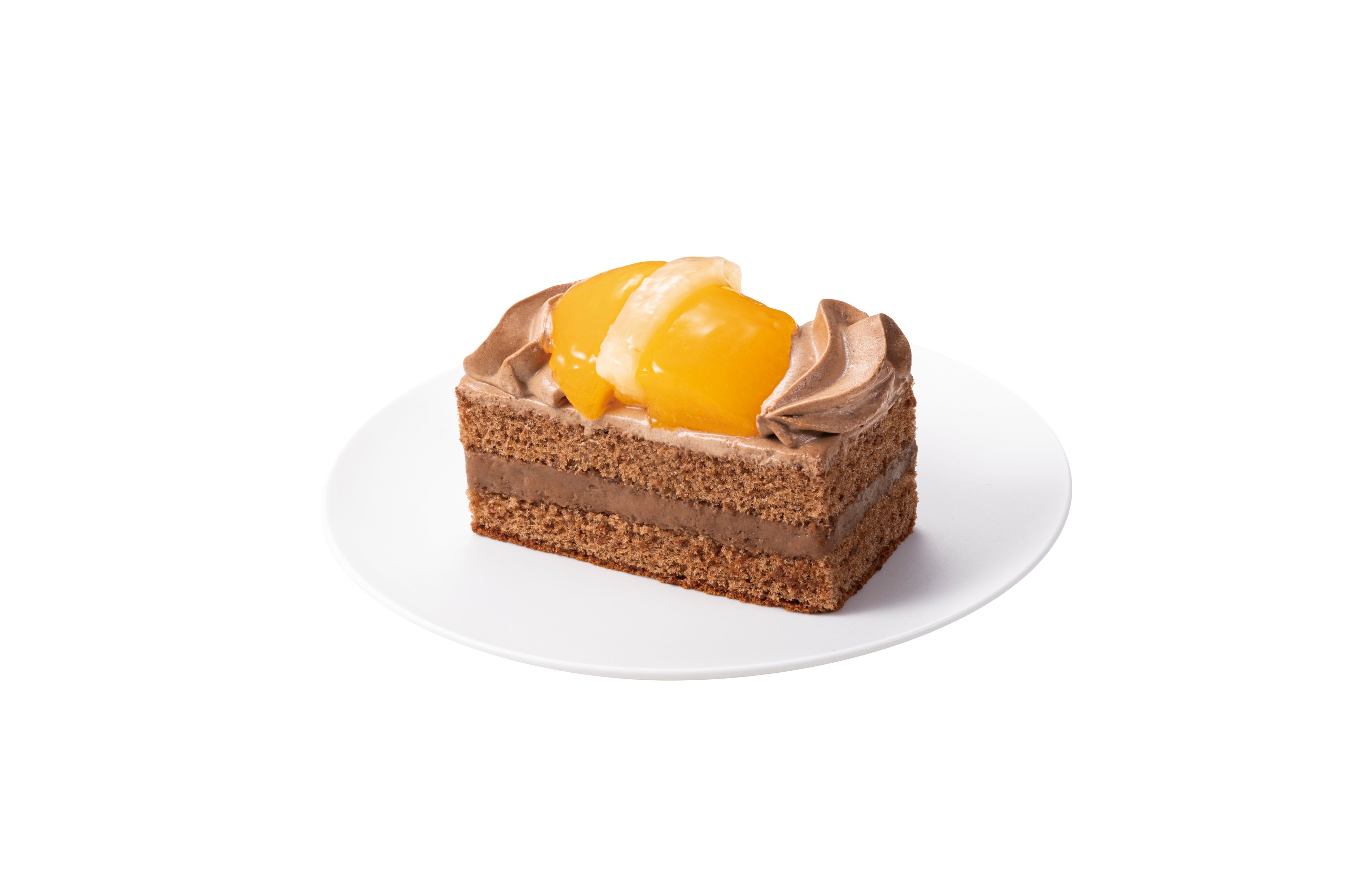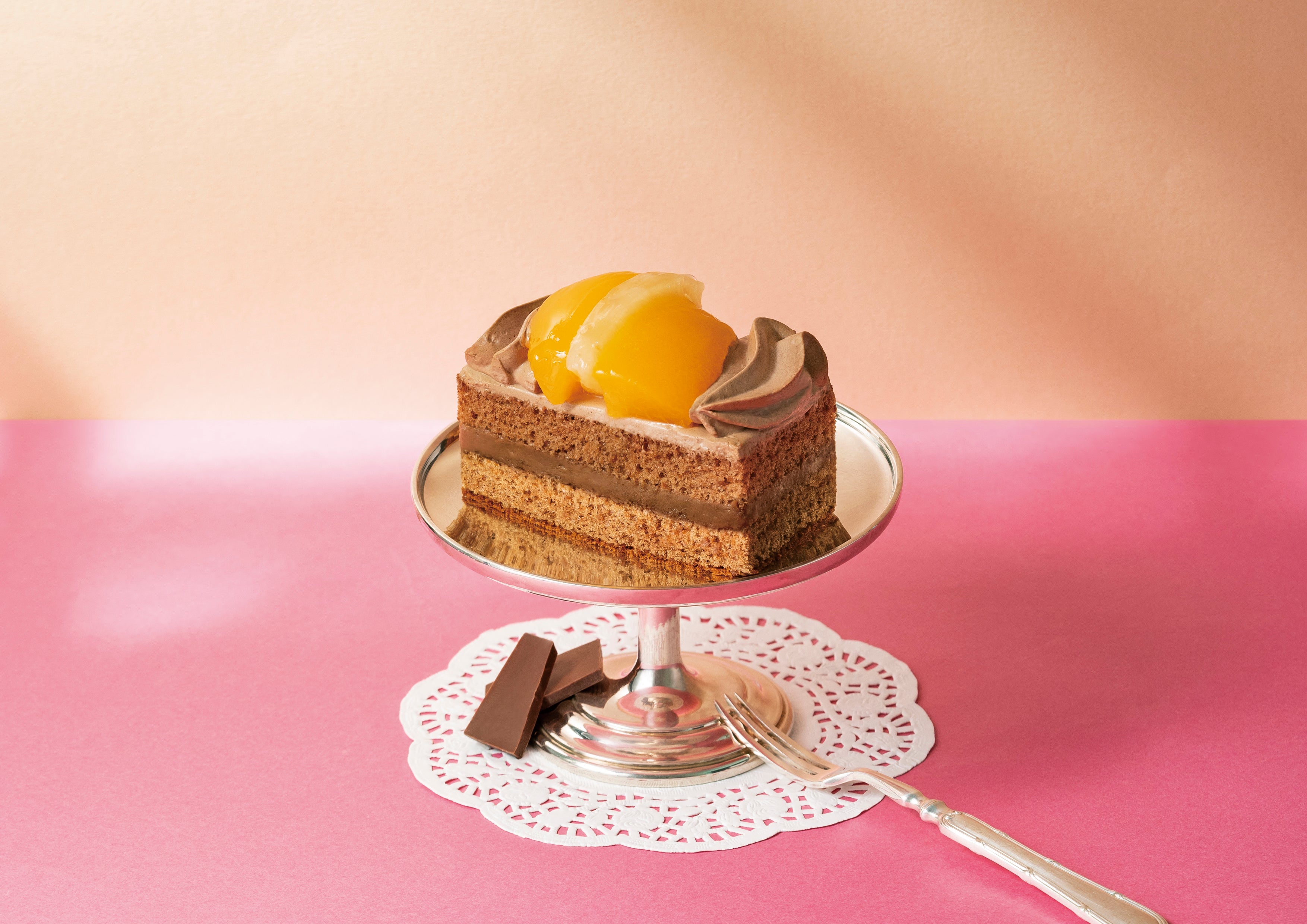 きめ細かく口溶けの良いココアスポンジでコクのあるチョコレートカスタードクリームをサンドし、天面には軽やかなチョコレートホイップクリームと、やさしい甘さのシロップ漬けの黄桃とパイナップルをトッピングしました。