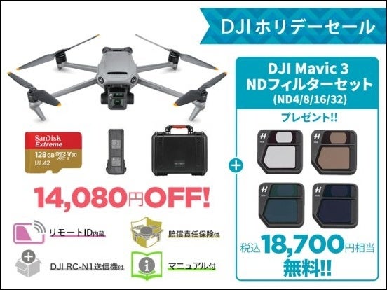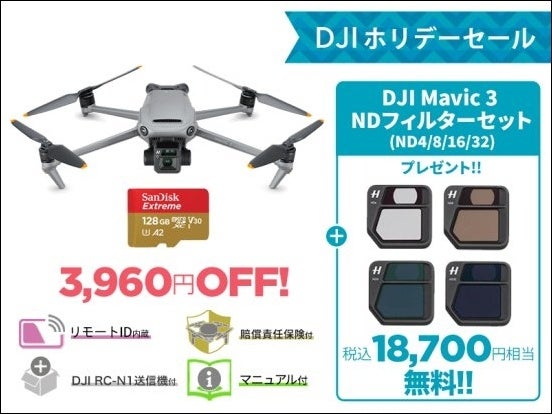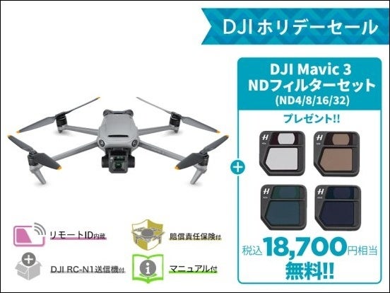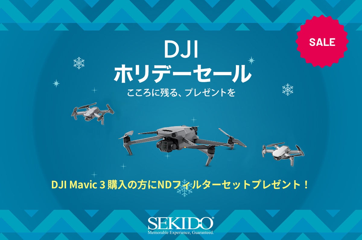 日本初のDJI正規販売代理店である株式会社セキド(本社:東京都港区、代表取締役:大下貴之)では、2022年12月23日(金)より、5.1K 50fps 対応 4/3型センサーのHasselbladカメラを搭載し圧倒的な空撮映像が撮影できるドローン「DJI MAVIC 3(ディージェーアイ マビック スリー)」を購入いただいた方に、光量を抑えて撮影の幅を広げるNDフィルター4枚セット(18,700円相当)をプレゼントする「DJI ホリデーセール」を追加開催いたします。
