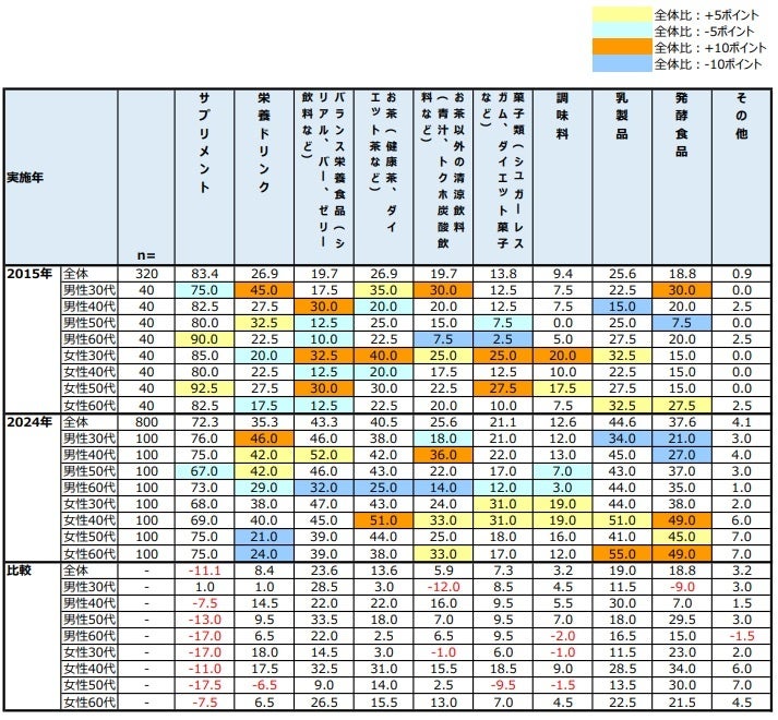 一方で、男性30代では「乳製品」と「発酵食品」、男性40代では「発酵食品」、男性60代では「バランス栄養食品」と「お茶」、「お茶以外の清涼飲料」、女性50代と60代では「栄養ドリンク」が他の層と比べ、選択率が低い傾向がみられた。