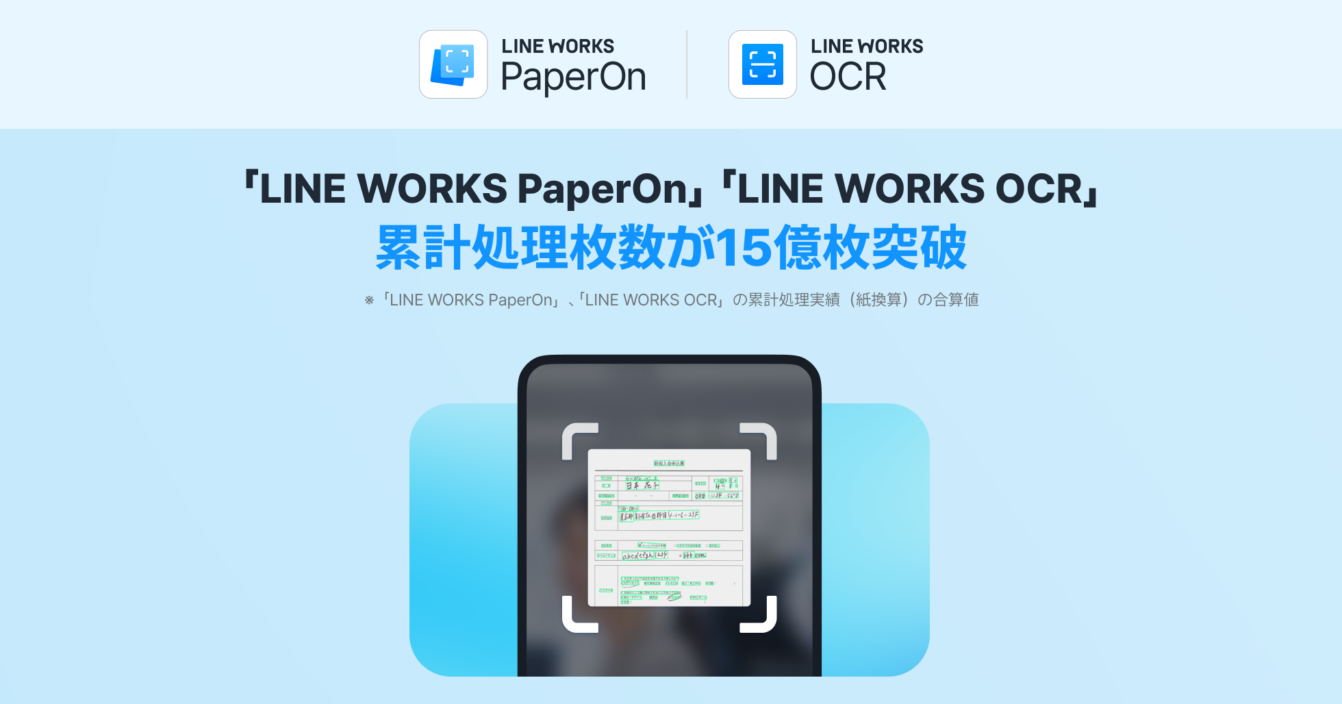 *1)本実績は、「LINE WORKS PaperOn」および「LINE WORKS OCR」の累計処理実績(紙換算)を合算したものです