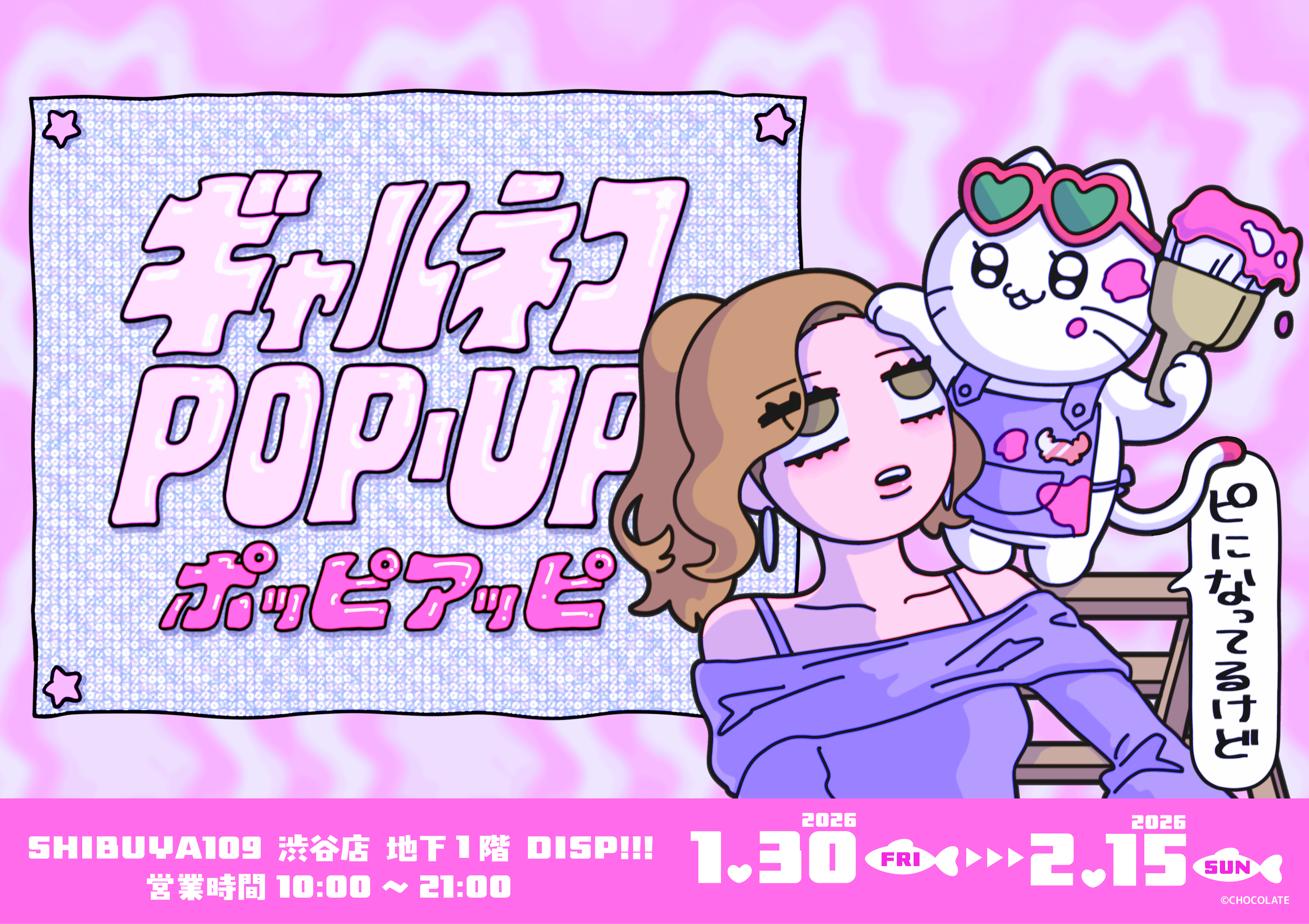 CHOCOLATE Inc.(本社:東京都渋谷区、代表取締役:渡辺裕介)は、ギャルに憧れるネコのキャラクター「ギャルネコ」のポップアップイベント「ギャルネコ POP-UP(ポッピアッピ)」を1月30日よりSHIBUYA109渋谷店にて開催することをお知らせいたします。