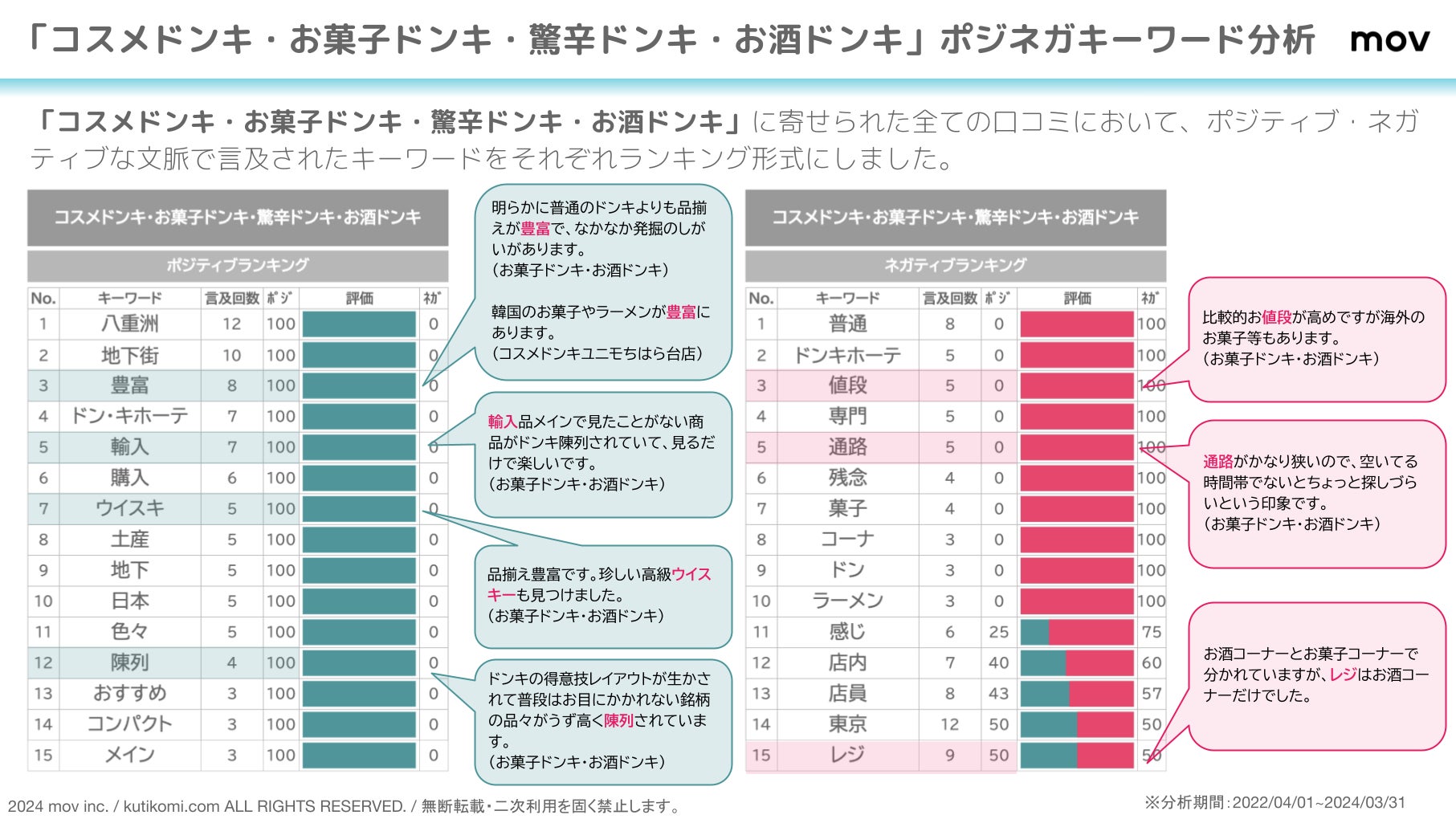 「コスメドンキ・お菓子ドンキ・驚辛ドンキ・お酒ドンキ」に寄せられた全ての口コミにおいて、ポジティブ・ネガティブな文脈で言及されたキーワードをそれぞれランキング形式にしました。