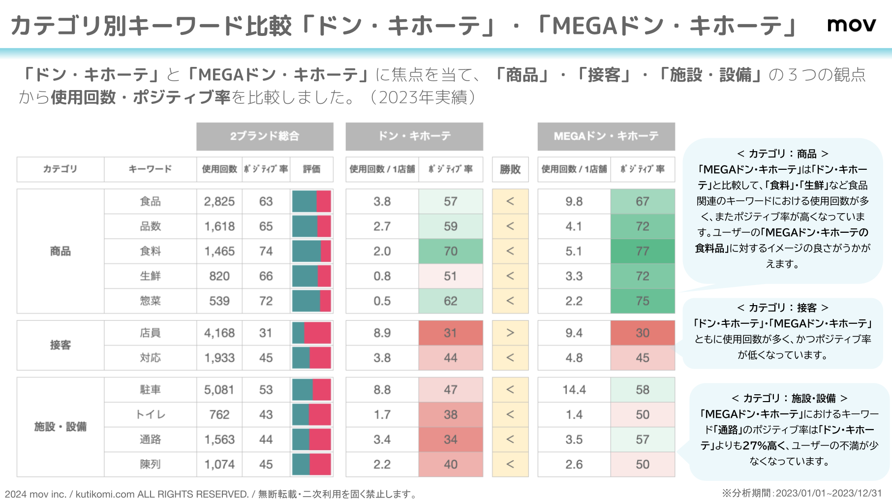 「ドン・キホーテ」と「MEGAドン・キホーテ」に焦点を当て、「商品」・「接客」・「施設・設備」の3つの観点から使用回数・ポジティブ率を比較しました。(2023年実績)