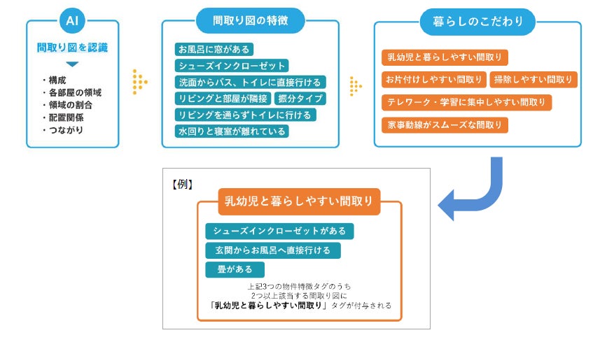 【「間取図特徴抽出AIモデル」の間取り図解析結果からハッシュタグ化までの仕組み】