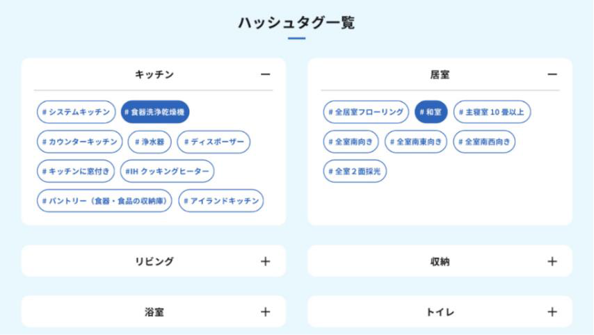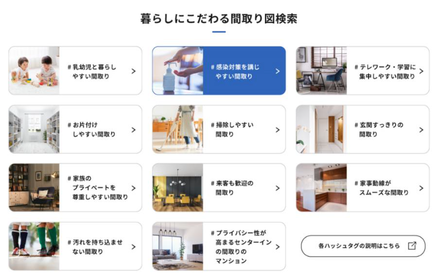 ②複数のハッシュタグを掛け合わせた「暮らしのこだわり」から物件検索(#乳幼児と暮らしやすい間取りなど)