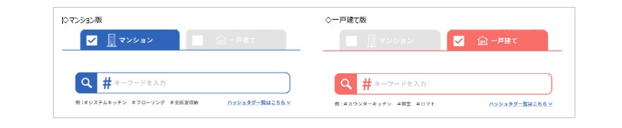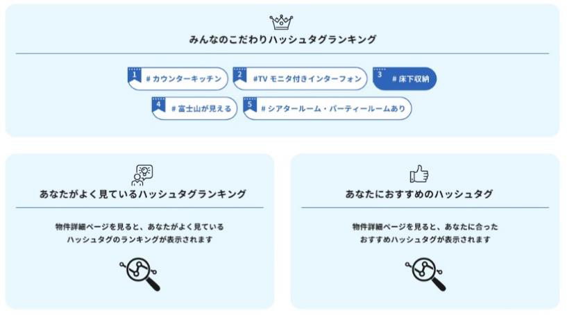 これまでの住まい探しにおいては、「何を重視して住まいを探したら良いか分からない」、「良いと感じた住まいと同じような条件の物件を探したいのに、見つけることができない」、など、お客様の希望に沿った方法での住まい探しが難しい場面がありました。その一方で昨今は、SNSの普及等によりハッシュタグ検索による類似情報の収集や検索が活用されています。