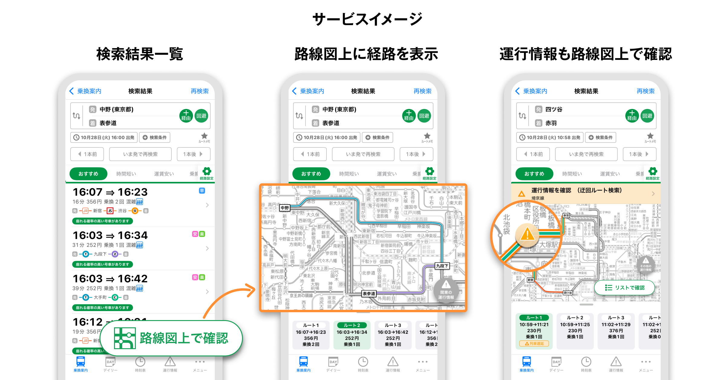 都心部などの複雑な路線網では、文字情報だけでは経路の全体像が把握しづらい場合があります。また、急いでいる時に素早く必要な情報だけを確認したい場合や、不慣れな土地、急な運行情報発生時などでは、より直感的な判断が求められます。これらのニーズに応えるため、「路線図ルート比較」を開発しました。ユーザーにとって最適なルートを、視覚的に素早く選択できる、意思決定の一助としてご活用いただけます。