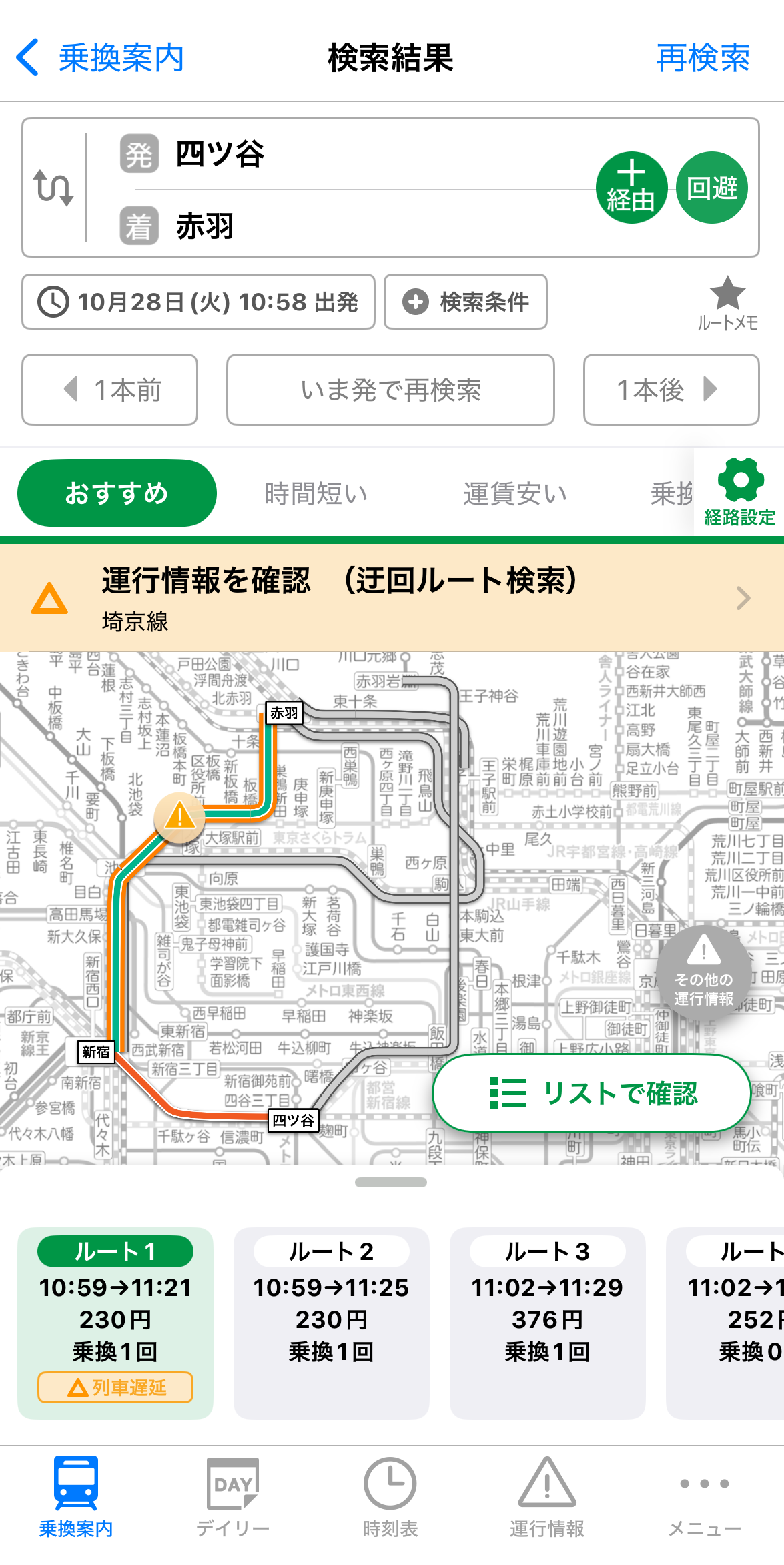 さらに、ルート上で運行情報が発生している場合、発生区間を路線図上で表示し、代替となる迂回ルートも路線図上に表示されます。