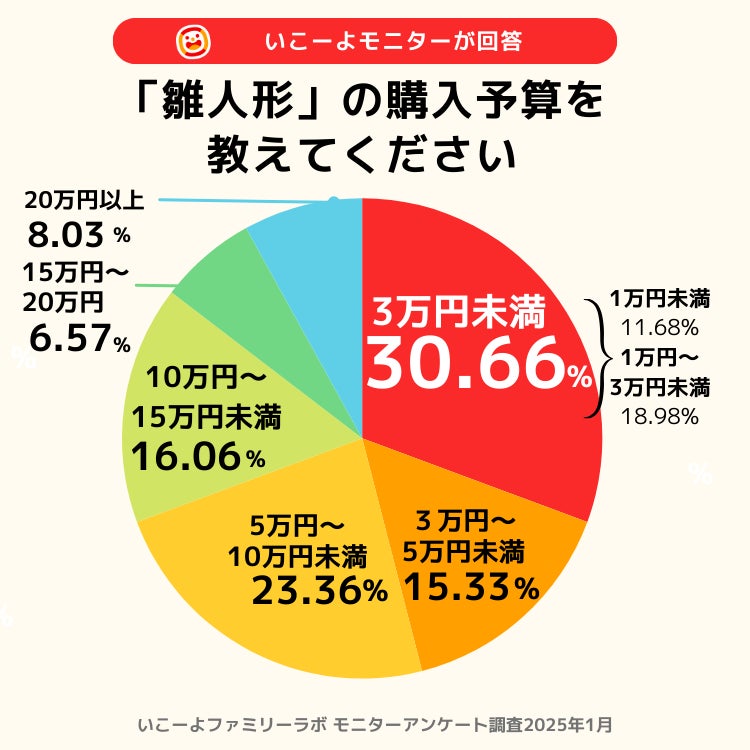 雛人形の購入予算の価格帯のアンケートで、最も多かったのは「3万円未満」。内訳は1万円未満が11.68%、1万円~3万円未満が18.98%です。