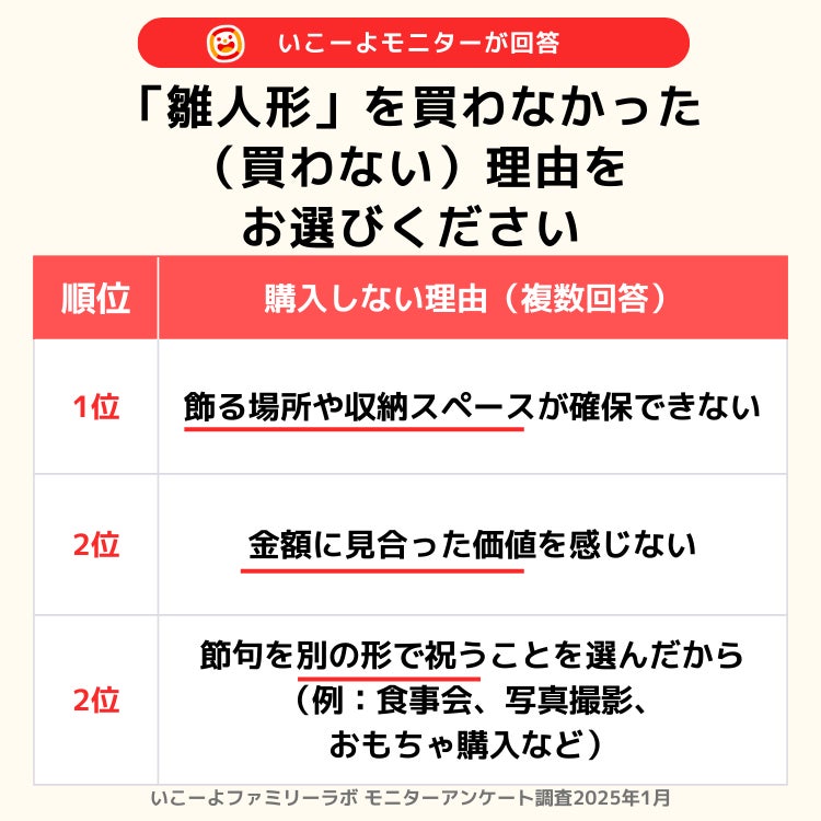雛人形を購入しない家庭に雛人形を購入しないと決めた理由もききました。1位は「飾る場所や収納スペースが確保できない」。