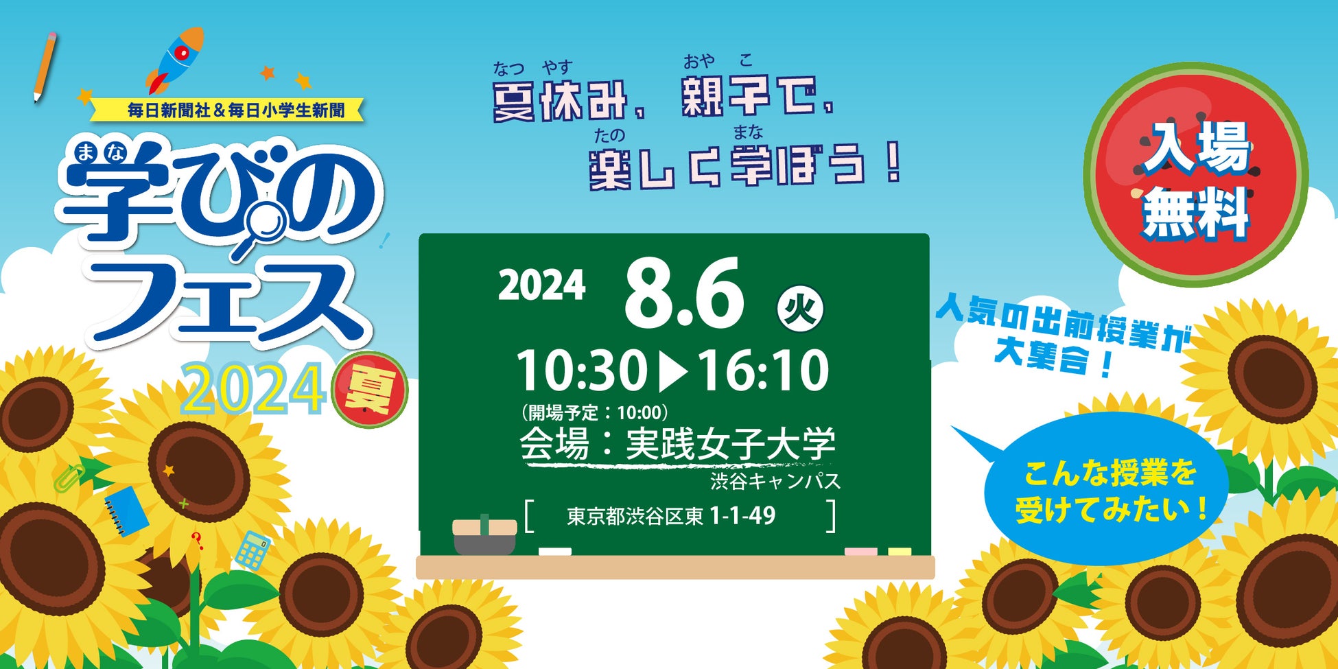 毎日新聞社(代表取締役社長:松木健)は8月6日(火)に「学びのフェス2024夏」を開催します。企業や団体の出前授業が集まっており、お子さまに体験と学びをお楽しみいただけます。会場は実践女子大学渋谷キャンパス(東京都渋谷区)。夏休みのお出かけにぴったりのイベントです。ぜひご参加ください。
