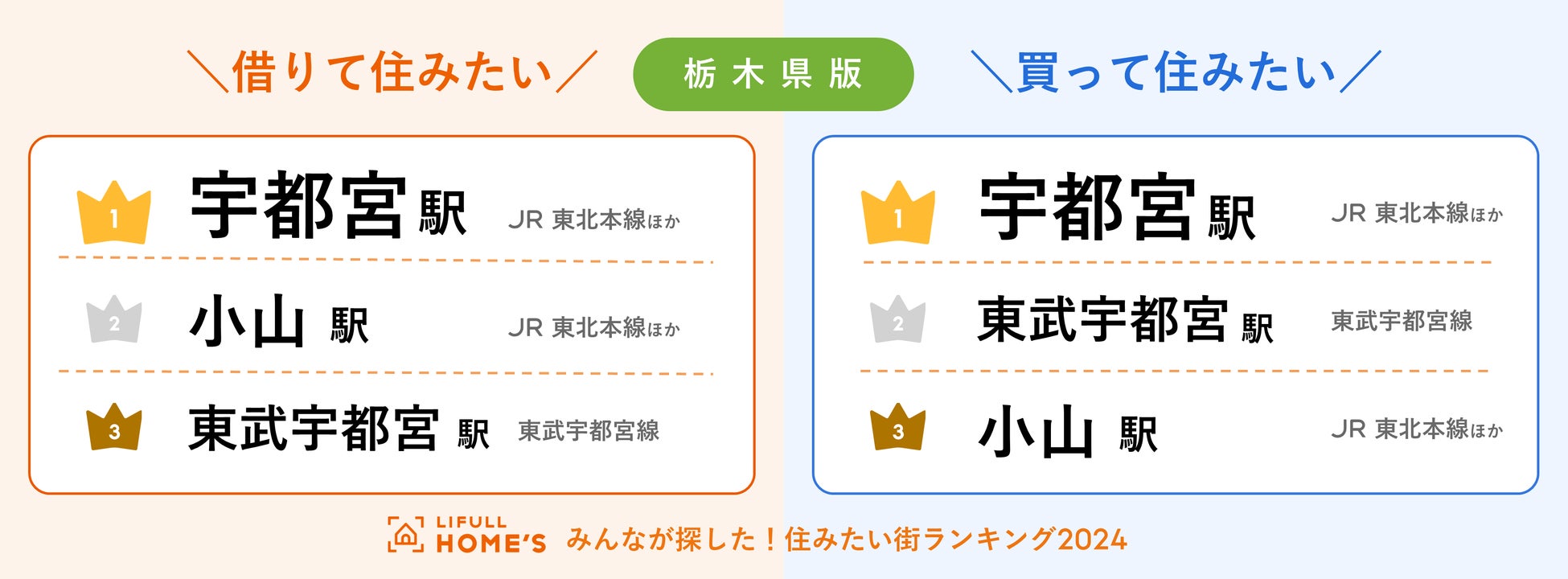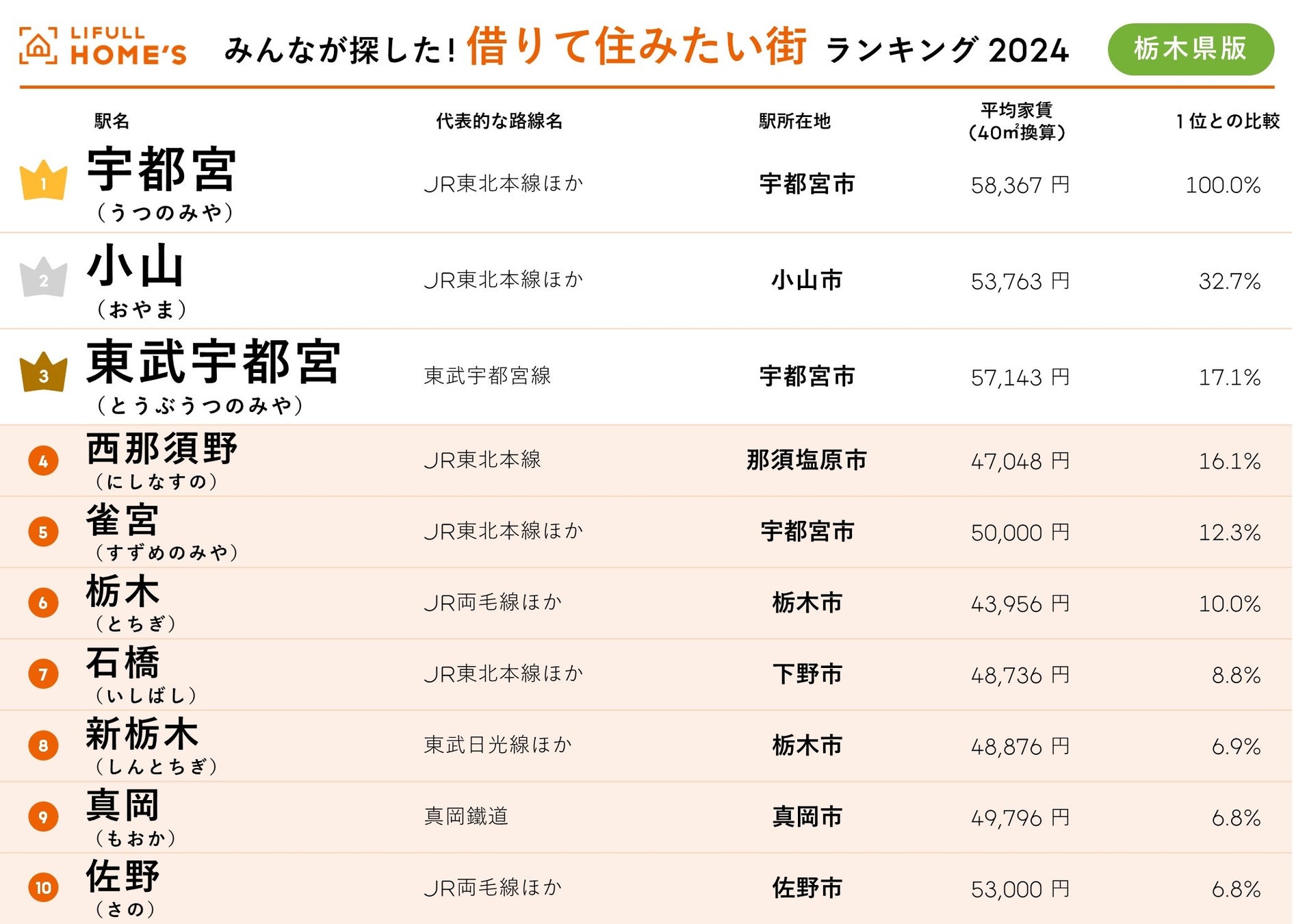 栃木県版「2024年 LIFULL HOME'S みんなが探した!借りて住みたい街ランキング」