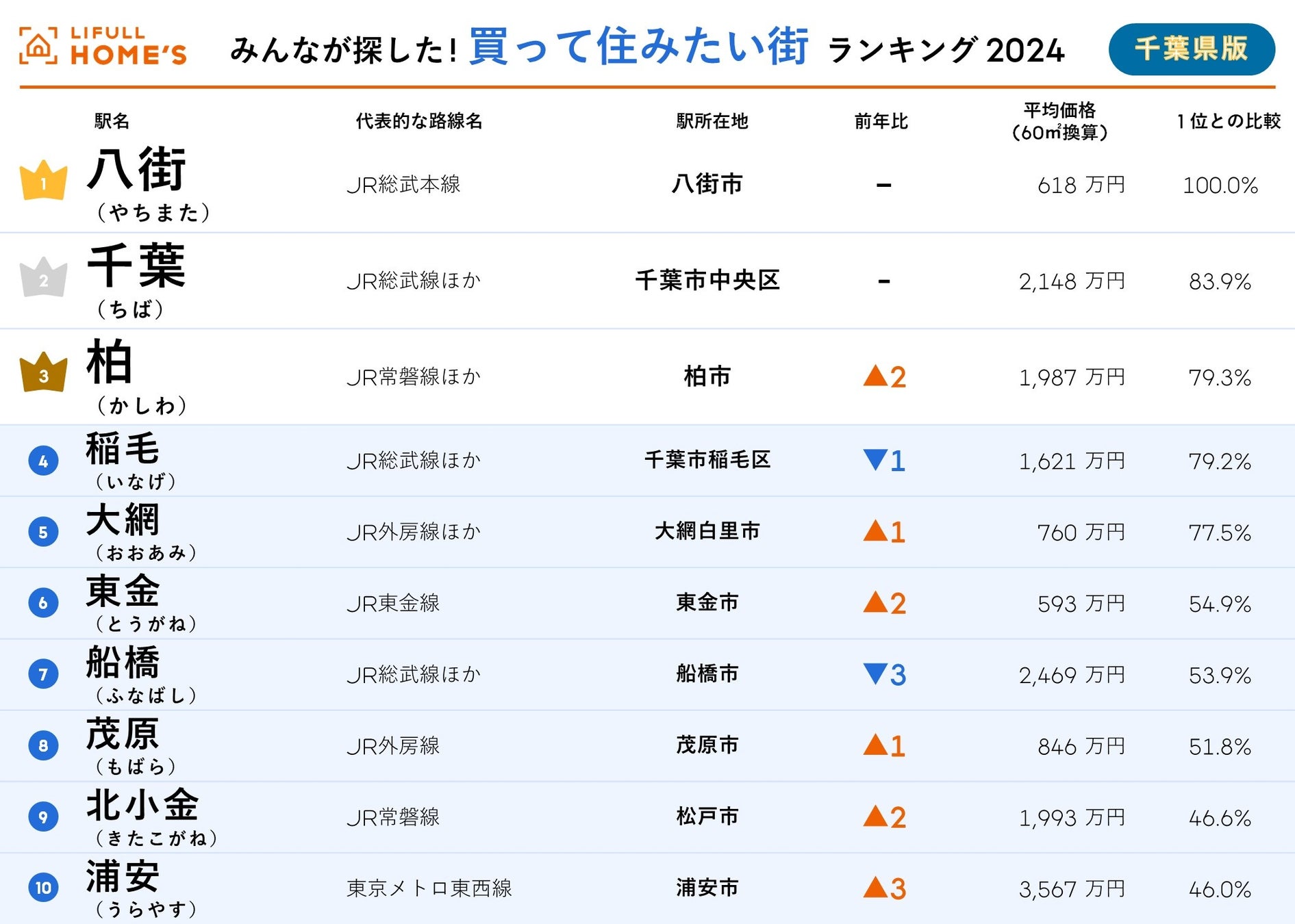 千葉県の「買って住みたい街」ランキングは「八街」が1位、2022年、2023年の首都圏版のランキングからも3年連続で1位となりました。2位は「千葉」、3位には昨年から2ランクアップした「借りて住みたい街」1位の「柏」が入りました。4位以下では5駅がランクアップしTOP10内の顔ぶれが大きく変化しました。