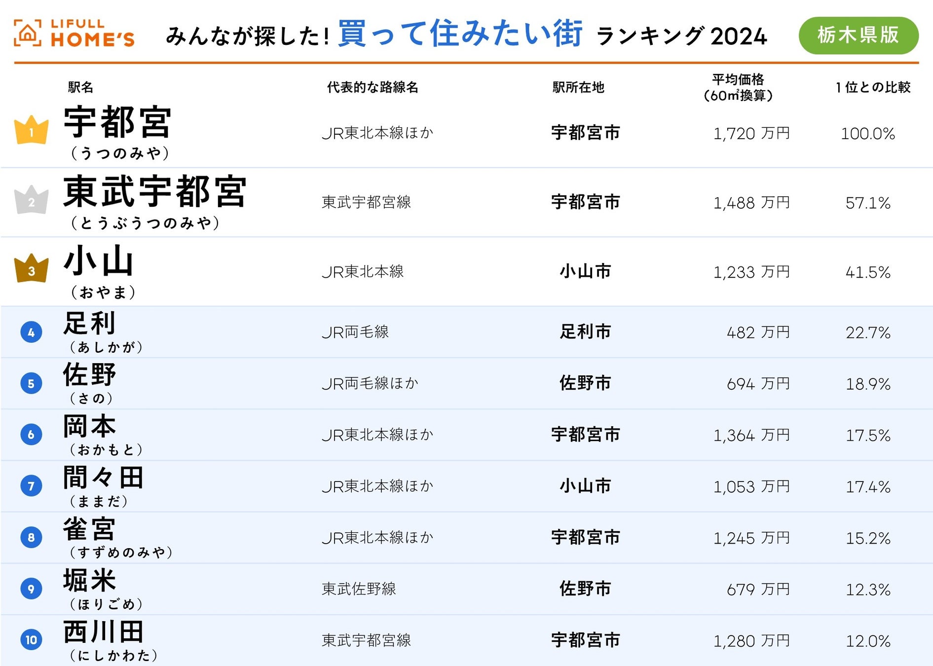 ■栃木県の買って住みたい街は1位「宇都宮」、TOP10は宇都宮市と小山市の駅が並ぶ
