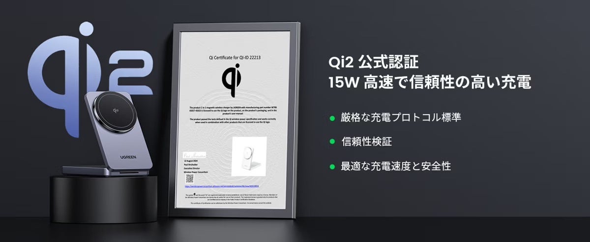 UGREEN 2-in-1 マグネットワイヤレス充電器は、Qi2急速充電認証に対応しており、iPhoneでは、Qiの7.5Wワイヤレス充電器よりも高出力な最大15W出力でワイヤレス充電が可能です。約2.5時間でiPhoneをフル充電できます。