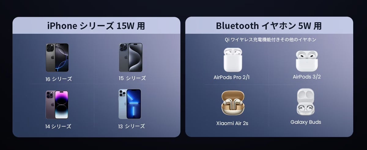 iPhone 16とAirPodsを同時に急速充電できます。iPhoneは最大15W出力でワイヤレス充電が可能です。出力30W以上のUSB充電器を推奨いたします。(※本製品に、充電器は付属されていません。)