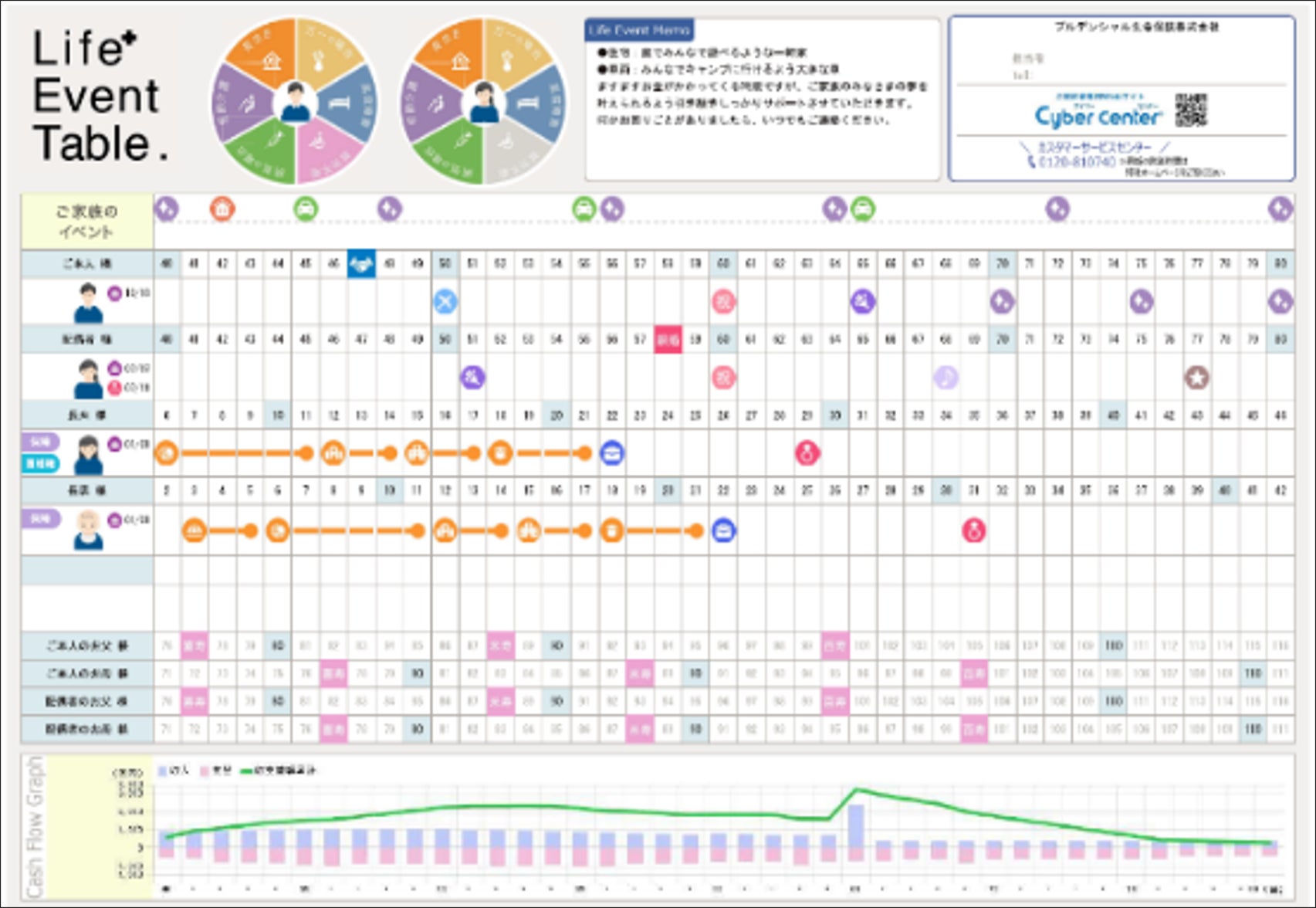 子どもの学費や結婚資金が必要となるタイミングや費用、今の想定年収で老後を迎えた場合の年金額、介護が必要になった場合の費用など、将来のイベントと収支をシミュレーションすることで、一人ひとりに合わせたコンサルンティングが可能。