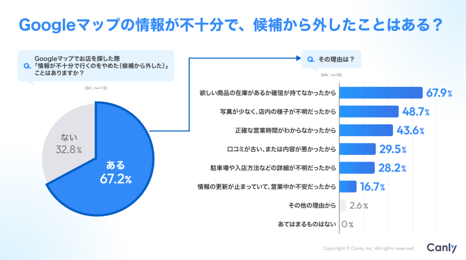 お客様が来店先を比較検討する際、マップ上の情報が不十分だと、それだけで来店候補から外されてしまうシビアな現実が明らかになりました。