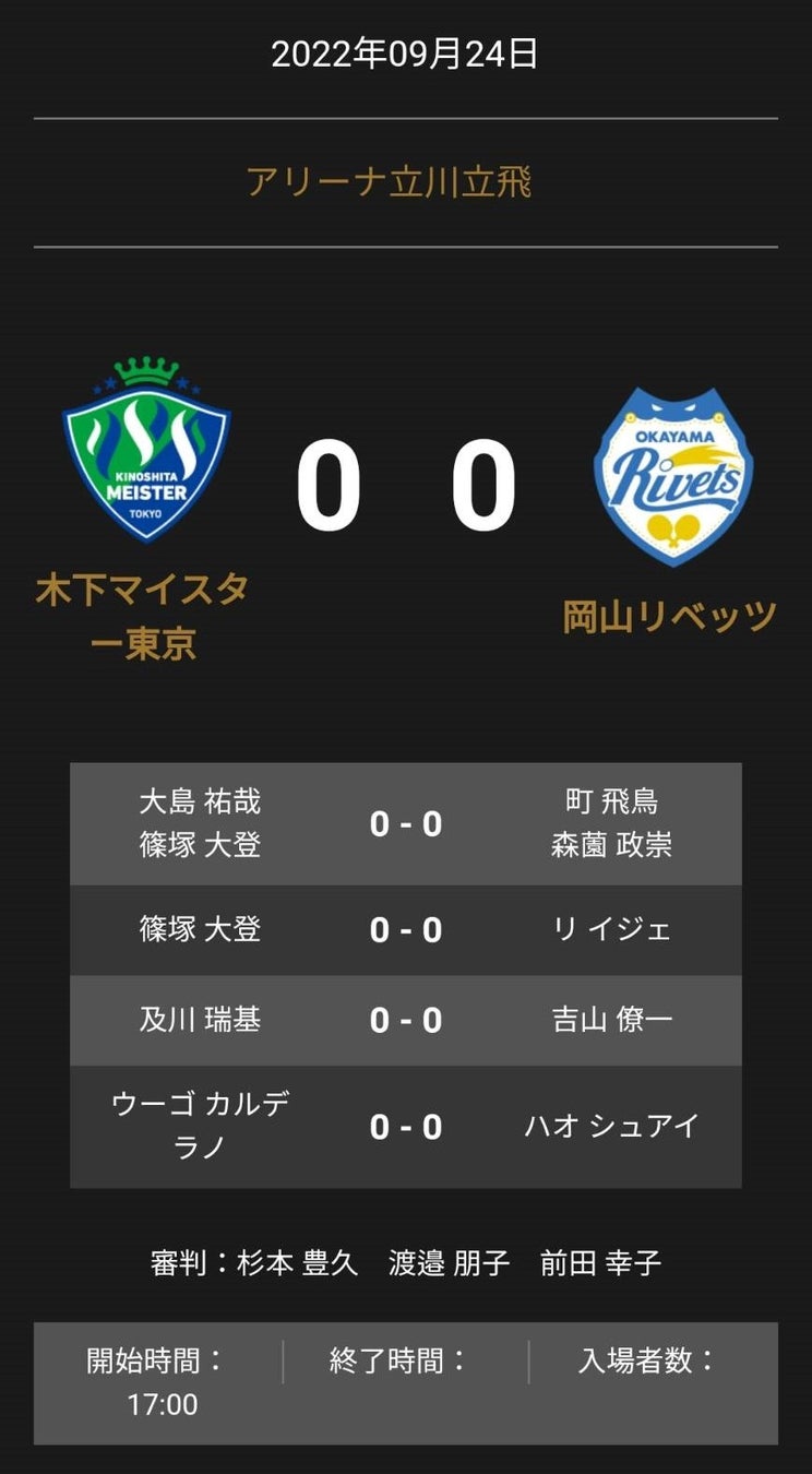 ノジマTリーグ 2022-2023シーズン 公式戦 9月24日開催 木下マイスター東京 vs 岡山リベッツ オーダー発表