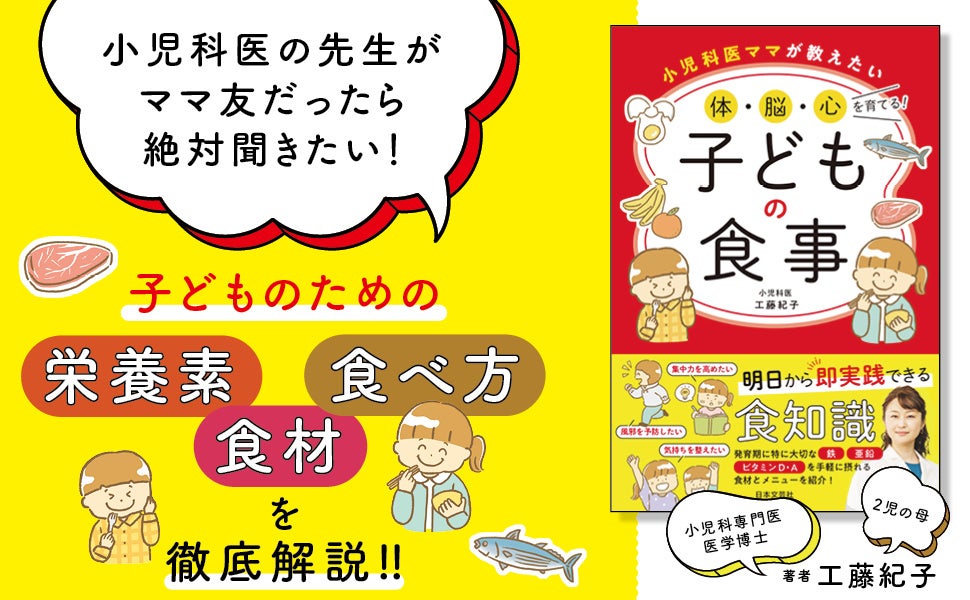 本書の著者、工藤紀子先生は、小児科専門医・医学博士で2児の母、栄養と子どもの発達に関連する研究で博士号を取得。保育園、幼稚園、小中学校の嘱託医を務め、クリニックでは年間のべ1万人の子どもを診察しながら子育て中の家族に向けて育児のアドバイスを行っています。工藤先生がお父さん・お母さんに知っておいてほしい、子どもの体・脳・心を健やかに成長させるために必要な栄養素・食材・摂り方をわかりやすく解説します。