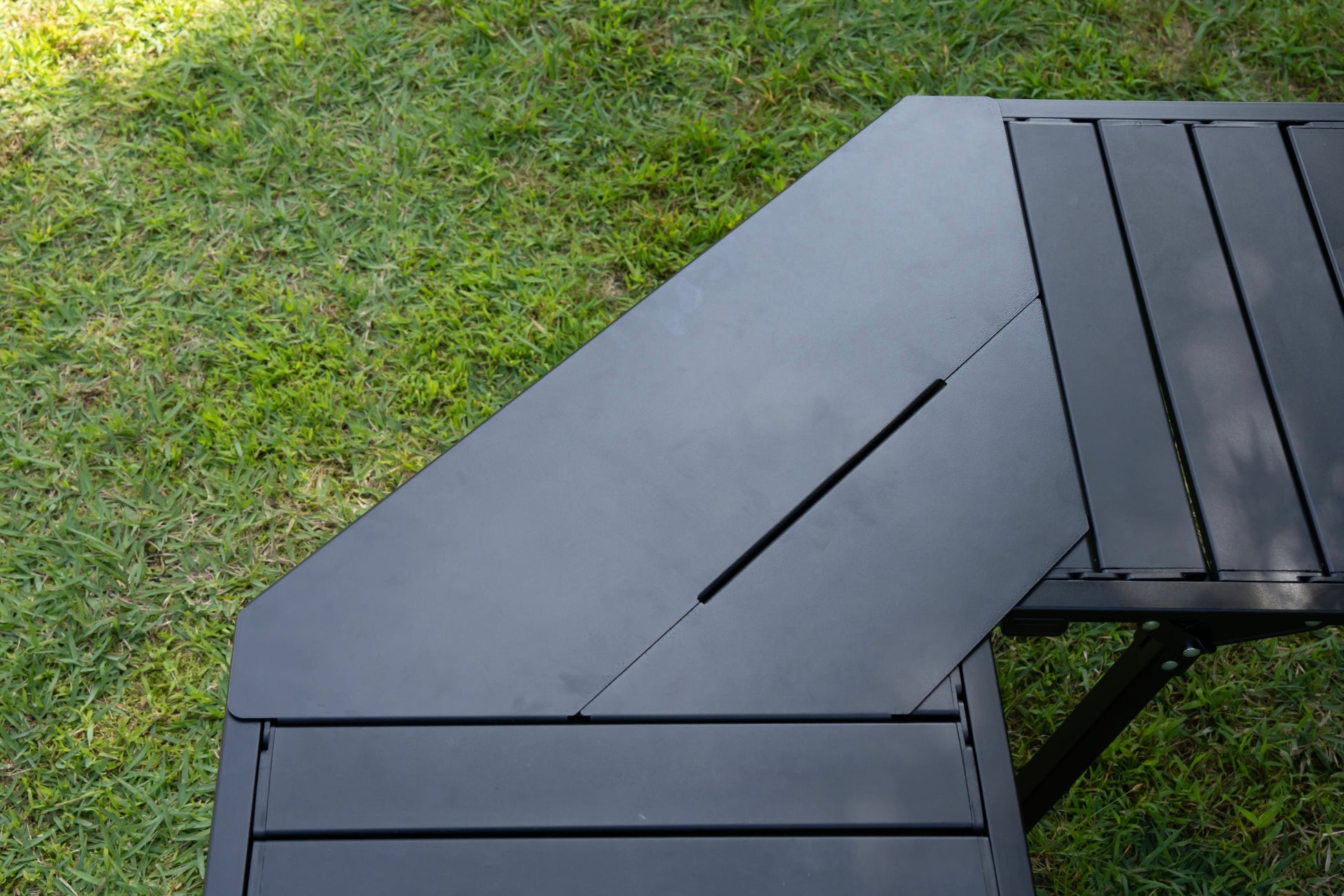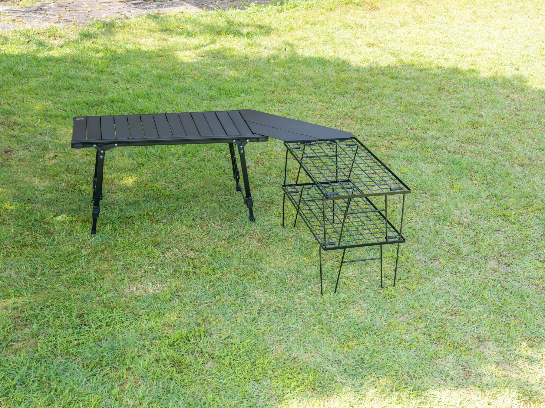 あわせて、「アルミユニットテーブル」をさらに快適にカスタマイズできるオプション3アイテム「アルミコーナー天板88」「アンダーラックフレーム88」「アルミ天板」も同日から販売開始いたします。中でも「アルミコーナー天板88」はキャンプサイトのレイアウト自由度を高める注目アイテムです。