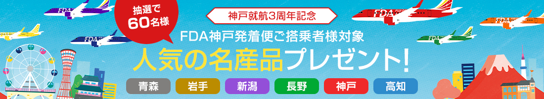 株式会社フジドリームエアラインズ(略称:FDA、本社:静岡県静岡市、代表取締役社長:楠瀬 俊一)は、神戸空港への就航3周年を記念し、FDA神戸発着便をご利用いただいた方を対象に、抽選で就航各地の名産品をプレゼントするキャンペーン実施しております。