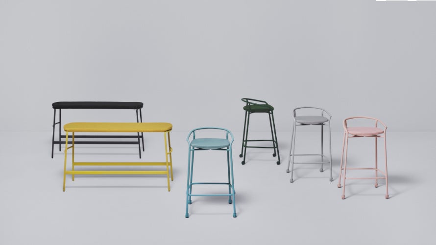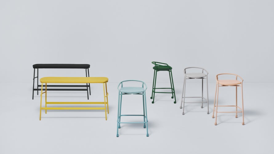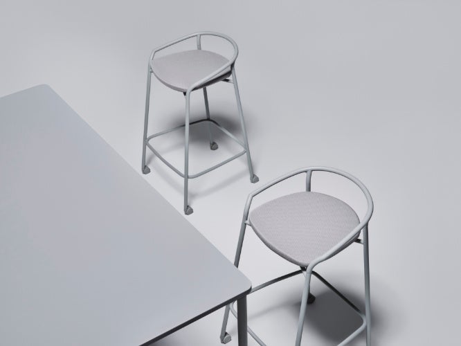 軽やかなキャスター付きハイスツールと、おおらかな座面の2人掛けハイベンチは自然と人を惹きつけ、オフィス内にコミュニケーションスポットを生みだします。いずれも十分な厚みをもったモールドウレタンが適切に体圧を分散させることで、心地よくお座り頂けます。