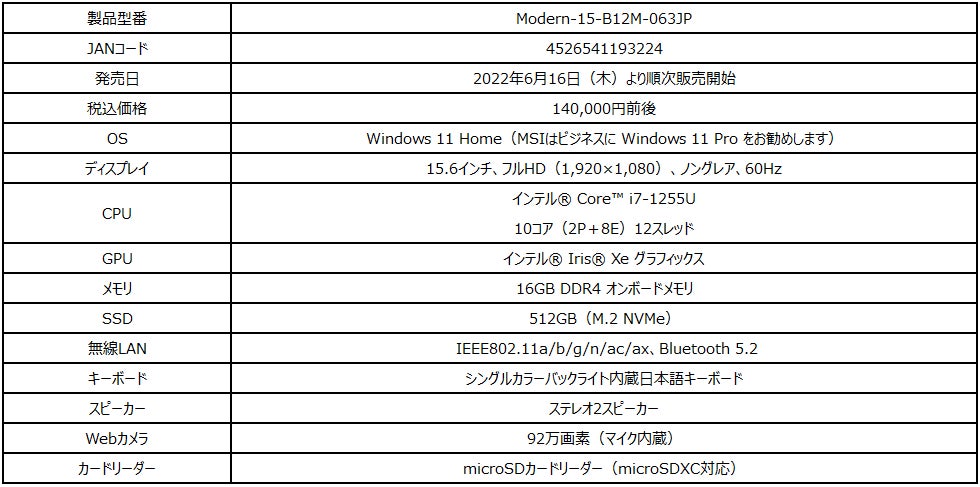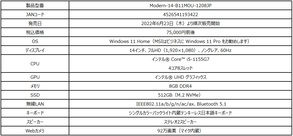 この度、エムエスアイコンピュータージャパン株式会社は、気軽にどこでも使えるデザインで生活に密着する薄型・軽量15.6インチビジネスノートPC『Modern 15 B12M』シリーズを2022年6月16日(木)より発売いたします。また、ビジネス・学業・プライベートなどで使用する初めてのノートPCとして最適でお手頃価格の薄型・軽量ビジネスノートPC「Modern-14-B11MOU-1208JP」を2022年6月23日(木)より発売いたします。