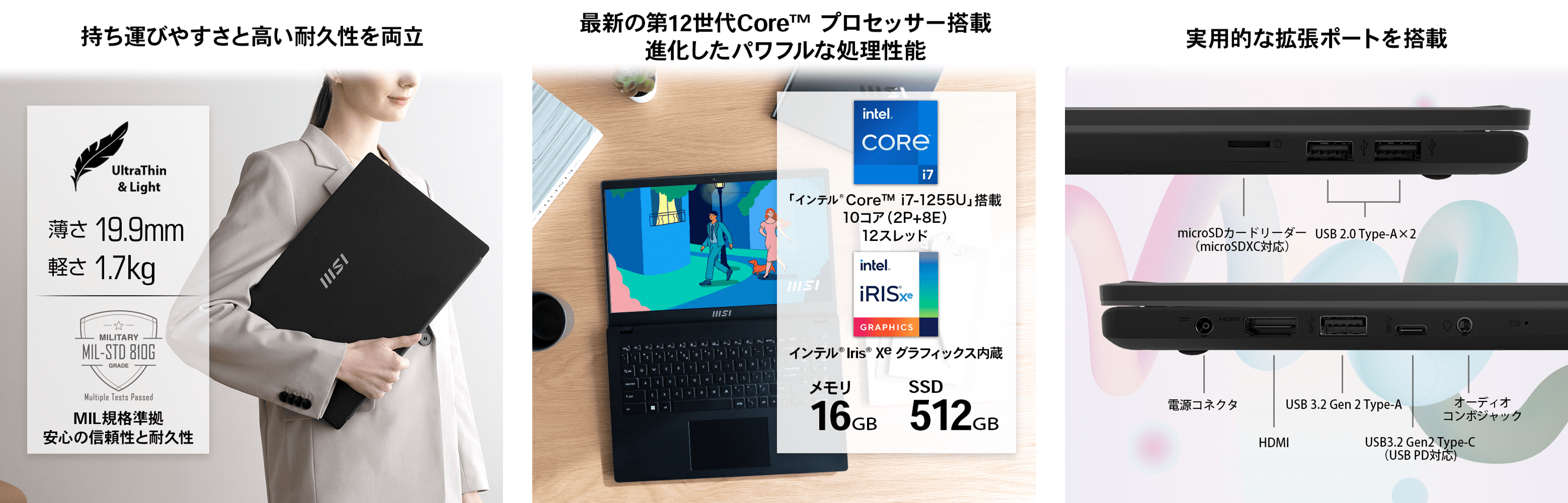 『Modern 15 B12M』シリーズは『気軽に、身軽に、いつでもそばに』をキーワードに、気軽にいつでもどこでも使えるデザインで生活に密着する薄型・軽量ビジネスノートPCとして新しいデザインと最新CPUを採用して誕生いたしました。クラシックブラックの本体カラーはオフィスやカフェなどのビジネスシーンだけでなく、キャンパスライフやプライベート用途でも溶け込むクールで落ち着いたデザインとなっています。薄さ19.9mm・軽さ1.7kgの本体はバックパックへ簡単に収納でき、ビジネス・学業・プライベートなどの様々なシーンで簡単に持ち運んで使用できます。衝撃や振動に弱いHDDやDVDドライブなどを搭載しないゼロスピンドル構成を採用し、ミリタリーグレードの高い耐久性と信頼性を備え、毎日ノートPCを持ち運ぶようなビジネスマンや学生の方でも安心してご使用いただけます。CPUに最新のハイブリッドコアアーキテクチャを採用し、パワフルなPコアと省電力なEコアを備え大幅に性能が向上した第12世代インテル® Core™ プロセッサーを搭載し、メール・文書作成・表計算などのオフィスソフトやビデオ会議ソフト、Webブラウザなどを同時に起動しても高速・快適動作を実現するパワフルな処理性能を備えています。拡張ポートには合計4つのUSBポートに加え、変換アダプタなしで液晶モニターやプロジェクタへ映像出力できるHDMIなど実用性を重視したポートを搭載し、外付けストレージを活用した大容量データの持ち運びや大画面モニターへ映像出力してプレゼンや資料作成・編集を行うことで作業の効率化が期待できます。