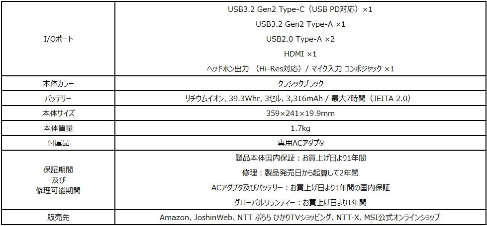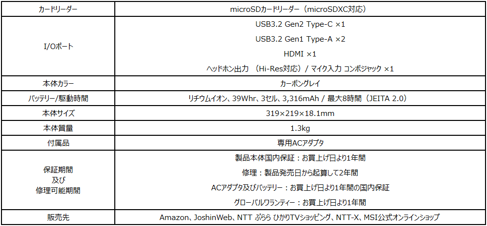 「Modern-14-B11MOU-1208JP」はお手頃価格ながら文書作成・表計算・プレゼンテーション作成を行うオフィスソフトやWebブラウザー、動画再生ソフトなど幅広い用途でサクサク高速動作を実現した薄型・軽量ビジネスノートPCです。薄さ18.1mm・軽さ1.3kgの本体はビジネスバックやバックパックに簡単に収納することができ、どこでも気軽に持ち運ぶことができます。振動や衝撃に弱いHDDや光学ドライブを搭載しないゼロスピンドル構成を採用し、アメリカのMIL規格「MIL-STD 810G」に適合する高い耐久性と信頼性と最大8時間の長時間駆動可能な長持ちバッテリーを備え、毎日の通勤・通学で持ち運んで使用する際にも安心。ディスプレイには文字がはっきり・くっきり見えるフルHD解像度(1,920×1,080)の14インチ液晶パネルを採用。CPUには性能と価格のバランスに優れた第11世代インテル® Core プロセッサーを搭載し、ビジネス・学業・プライベート用途で毎日ノートPCを使用するような方が複数のソフトを同時に起動してもノートPCの動作が重くなるようなことのない高速・快適動作を実現。合計3つのUSBポート(Type-C ×1、Type-A ×2)を備え、マウス・キーボード、プリンタや外付けHDDなどの複数のUSBデバイスの接続に加え、スマートフォンの充電やデータ転送などが可能。さらに、変換アダプタ不要で外付けモニターやプロジェクタへ映像出力できるHDMIを標準搭載。場所を選ばず働く新しいスタイルのテレワークやビデオ会議に参加する際に必須機能である無線LANやマイク内蔵Webカメラも内蔵。低価格ながら幅広い用途で活躍できる性能と機能を備えた万能モデルです。日本国内の各地にある「MSI公認サポート店」にご相談いただければ、ご購入後でも製品保証を維持したままご使用用途に合った最適なメモリ容量やSSD容量へカスタマイズすることが可能(有償サービス)となっています。