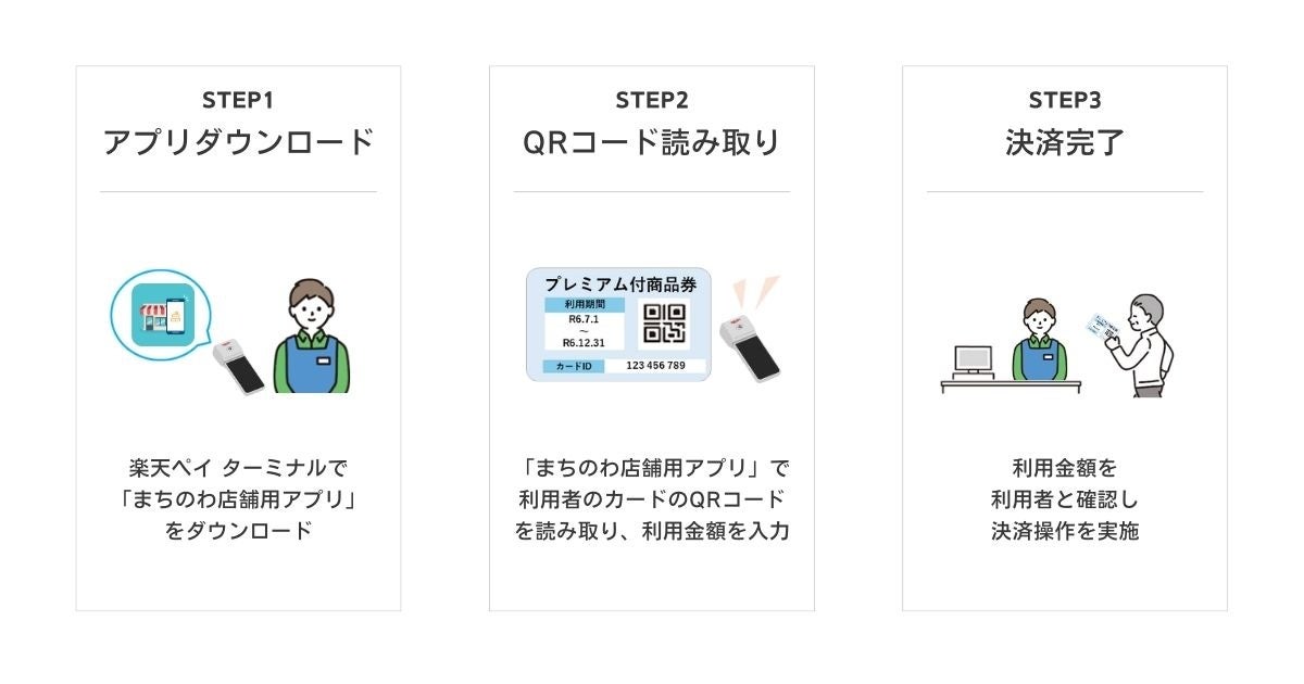 このたび「楽天ペイ ターミナル」に「まちのわ店舗用アプリ」がサービス拡張されることで、「楽天ペイ ターミナル」でカード版「プレミアム付商品券」のQRコードを読み取ることができ、決済から売上管理までオールインワン決済端末ひとつで対応することが可能となります。これにより、店舗は従来の紙の商品券と比べ事務負担が少なく、商品券の売上管理や精算換金状況の確認ができ、店舗運営業務の効率化を図ることができます。