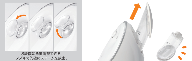 スチーム吹出口のノズルは3段階に角度調整ができるので、首やデコルテなどの気になる場所にも当てやすいです。また、水タンクが外れるので補充もお手入れも簡単です。