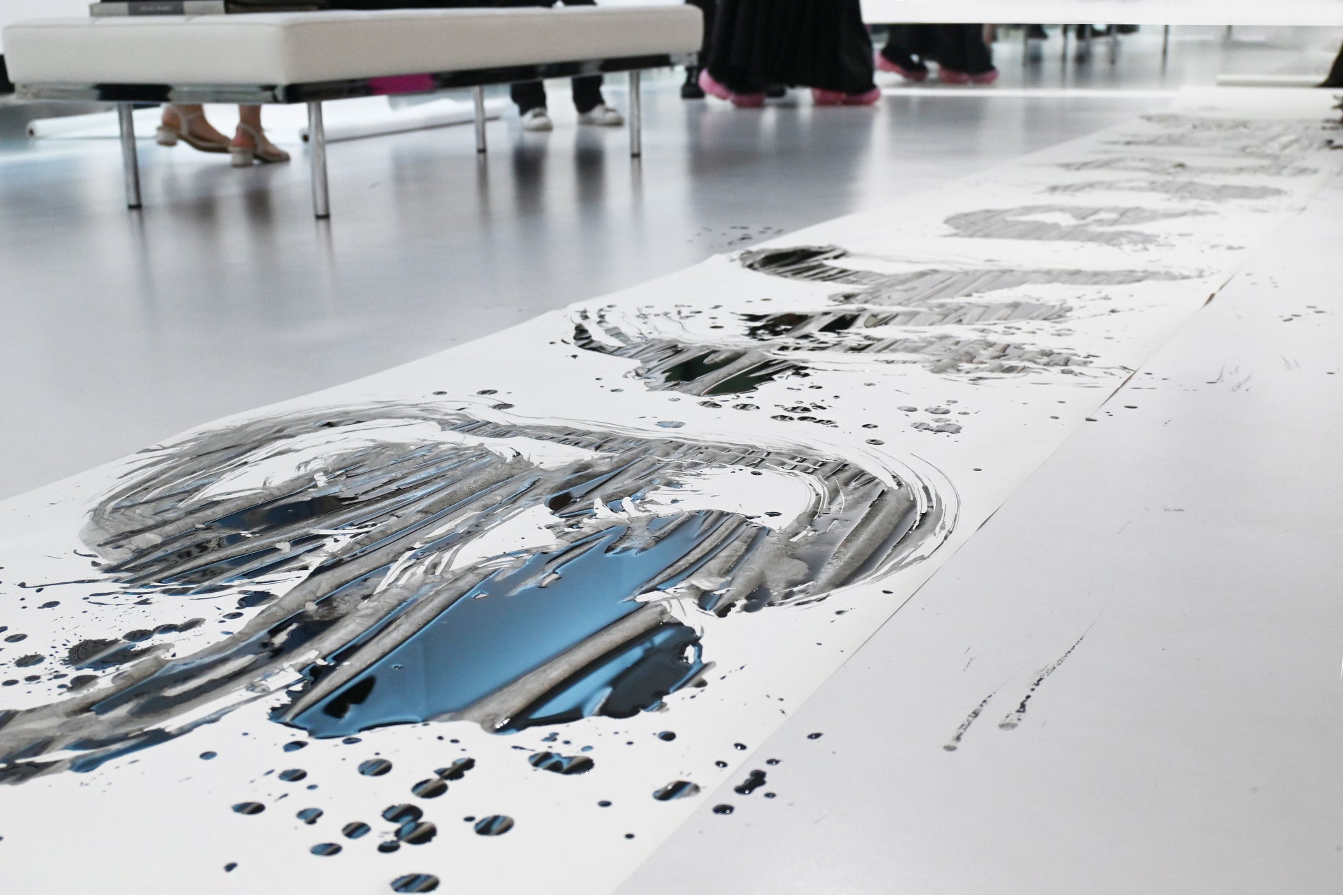 初日のオープニングイベントでは、書道パフォーマンスが披露されました。注目を集めたのは、その斬新な手法。筆の代わりに用いたのは、人形の髪の毛。全長約7メートルに及ぶ紙の上に現れたのは、「幽玄の笹蟹」。「幽玄」という日本の伝統的な美意識に、蜘蛛の雅称である「笹蟹」を響き合わせることで、曖昧さや妖しさを内包した独自の世界観が立ち上がり、観客を魅了しました。