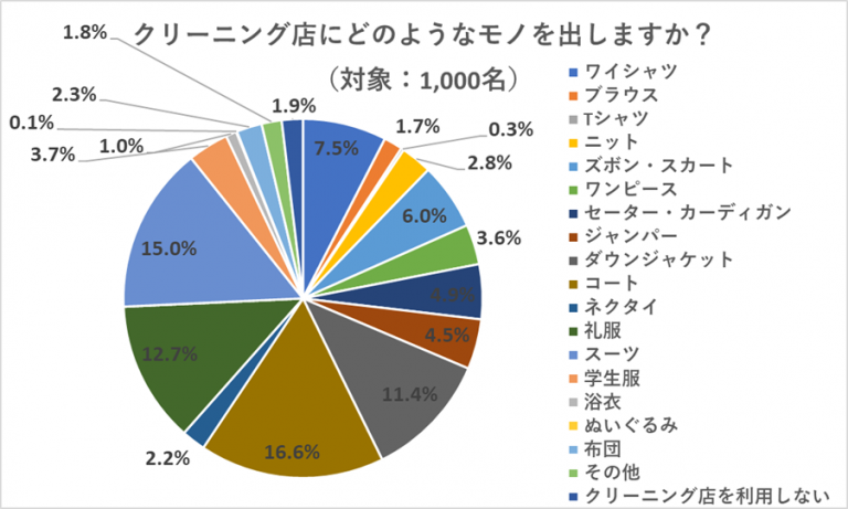 「クリーニング店にどのようなモノを出しますか?」という質問に対しては、「コート」と答えた人が最多で16.6%、次いで「スーツ」と答えた人が15.0%、「礼服」と答えた人が12.7%でした。他にも、様々なモノをクリーニング店に出していることが分かりました。