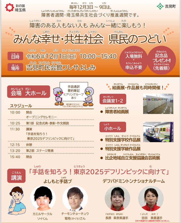 12月3日~9日の「障害者週間」、「埼玉県共生社会づくり推進週間」を記念し、障害や障害者に対する県民の理解を深め、共生の心を育む地域づくりを推進するため、「みんな幸せ・共生社会 県民のつどい」を開催します。