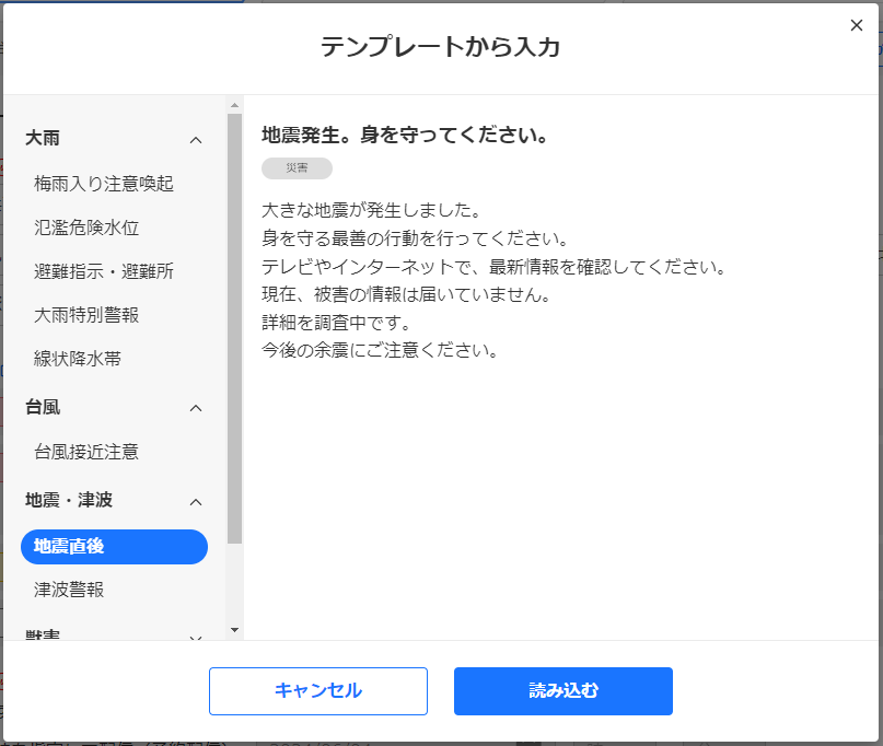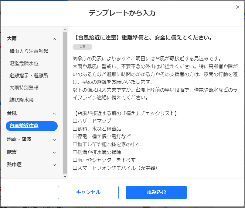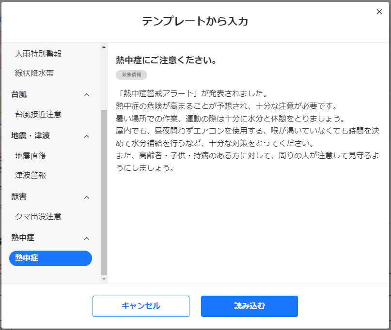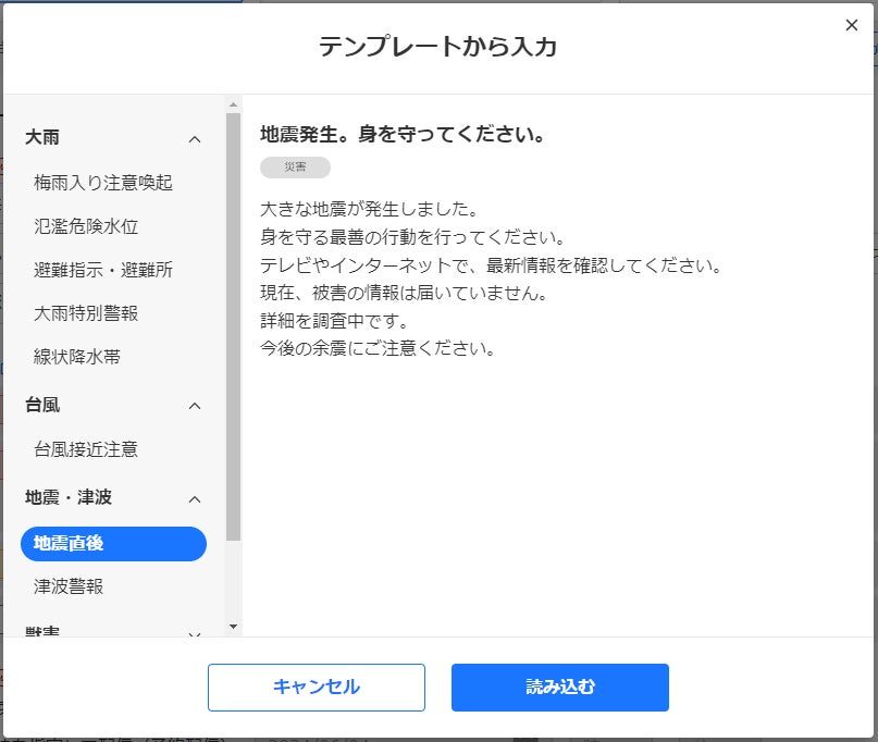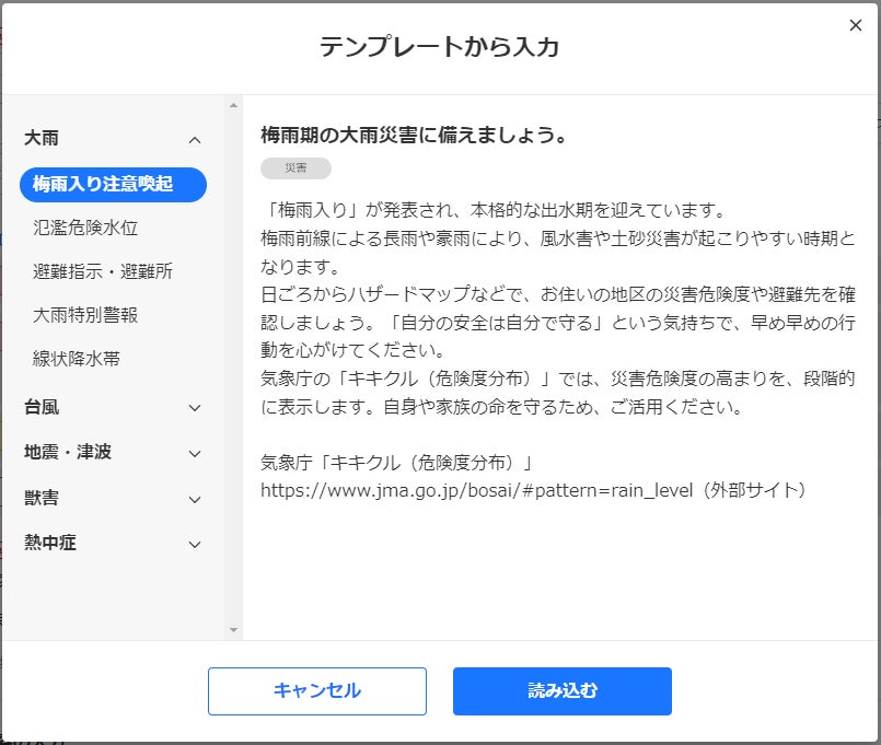 各テンプレートの内容はテンプレート機能案内ページ(※4)からも常時確認できます。文案は自治体内で利用している他の情報配信ツールへの転用に加え、発信予定内容について事前に庁内で承認が必要な場合は、その事前決済にも活用することができます。