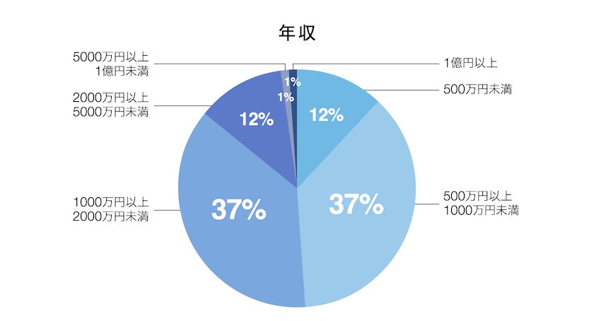 年収の割合については、「1000万円以上2000万円未満」と「500万円以上1000万円未満」が37%で最も多く、次いで「2000万円以上5000万円未満」と「500万円未満」が12%、「5000万円以上」が2%という結果になりました。