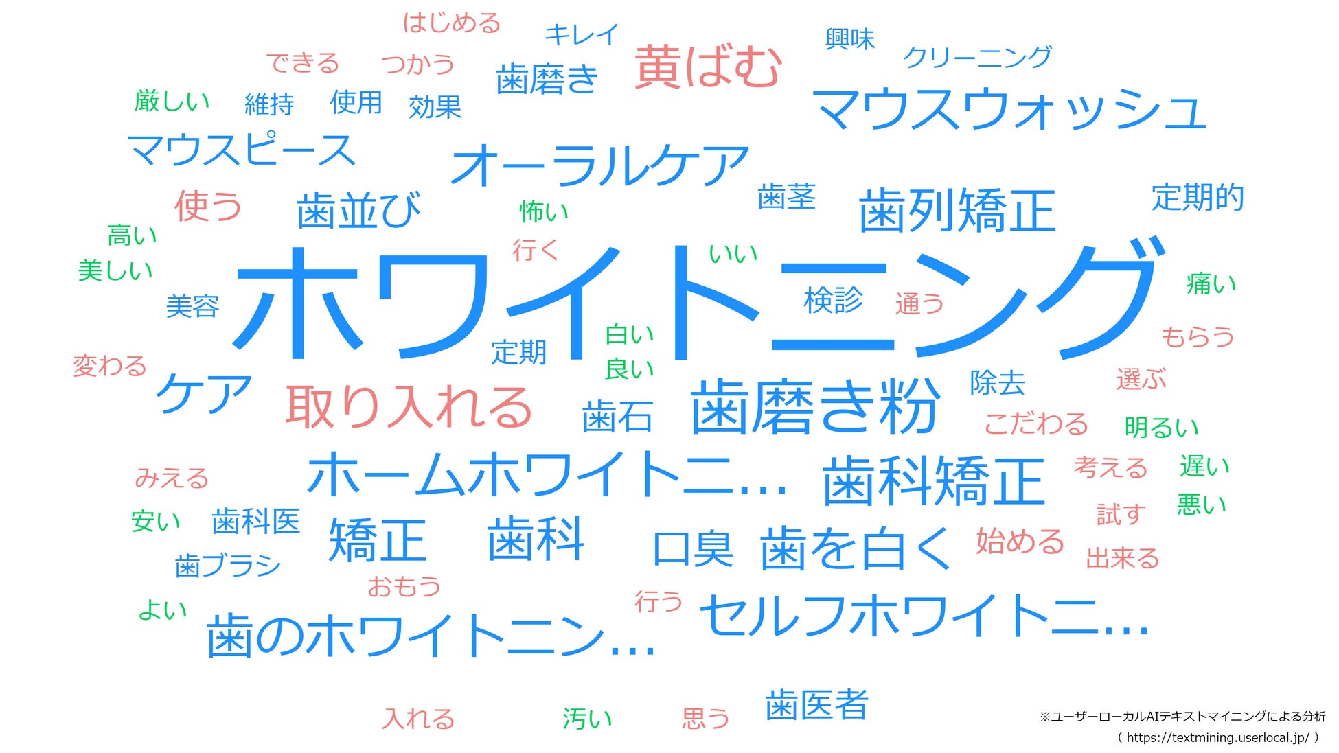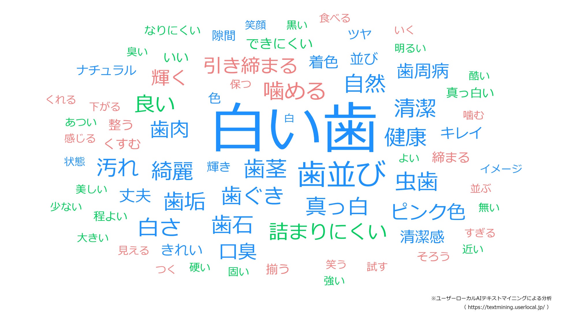 ⇒最も多く登場したワードは「白い歯」でした。輝く白い歯は誰もが憧れますよね。