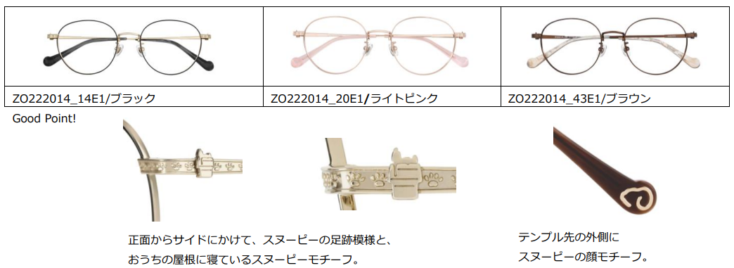 今回のメガネは、クラシカルなデザインで上品にかけられる「CLASSIC LINE(クラシックライン)」、さらっと気取らずかけられる「CASUAL LINE(カジュアルライン)」、かけ心地の良さをプラスし、安心してかけられる「COMFORT LINE(コンフォートライン)」の3ラインをご用意しました。その他にも、カラフルで可愛いクロスや、メガネをかけたオリジナルのスヌーピーアートが入ったスタンドケース、小粒のコットンパールをアシンメトリーに配置したおしゃれなグラスコードなど、スヌーピーの魅力が詰まったグッズも取り揃えました。