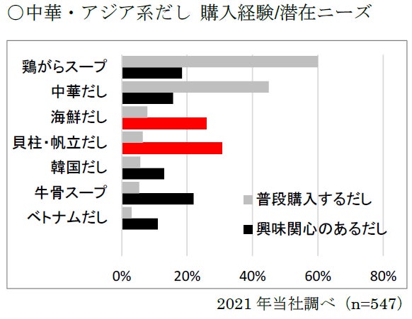 海鮮系のだしに対する潜在ニーズは中華だしに次いで高い傾向が伺えます。単身世帯において、中華調味料の利用機会は増加傾向であるのに対し、「手に取りやすい価格」「素材の味」「少量タイプ」といったことが、トライアル喚起のポイントとなっています。