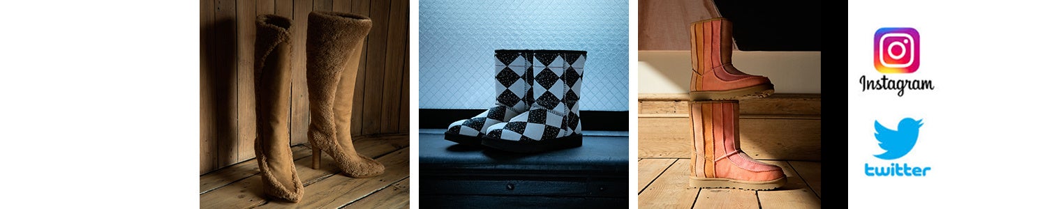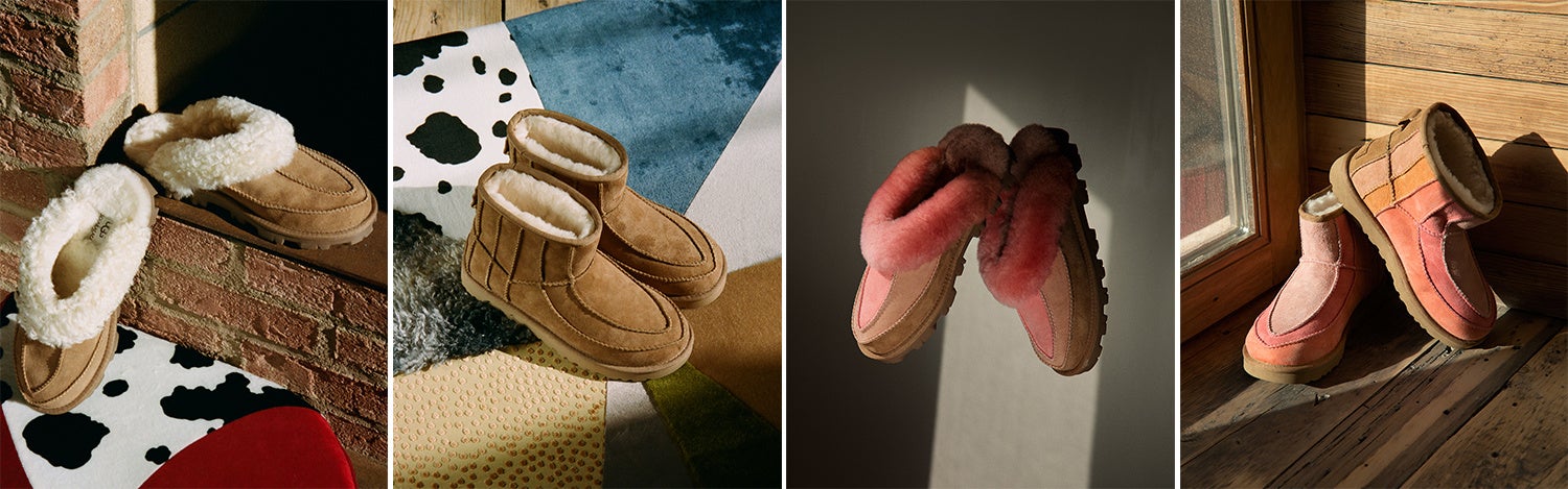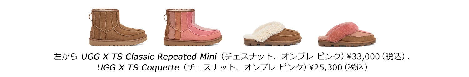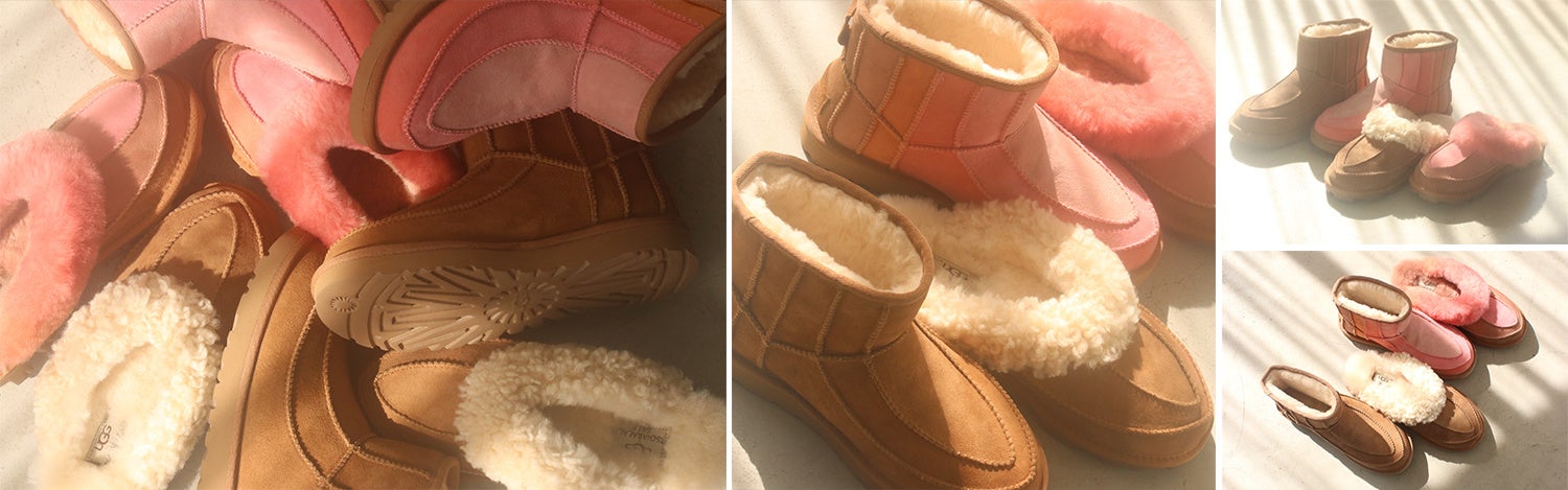 キャンバスをベースにしたシャバララ・セルフのミクストメディアの美学をアイコニックなClassic Mini(クラシック ミニ)やCoquette(コケット)に落とし込み、UGGのタイムレスなアイテムを縫い合わせたデザインが特徴の新たなスタイルにアップデートしたこのコレクションは、紛れもなくシャバララらしさが表れながら、UGGらしくもあります。ニュートラルなチェスナットカラーと、セルフの彫刻作品『Loveseat(ラブシート)』からインスピレーションを得た、フェミニンなもの全てをセレブレートするような「新たなニュートラル」ピンクのグラデーションカラーの2色で展開します。